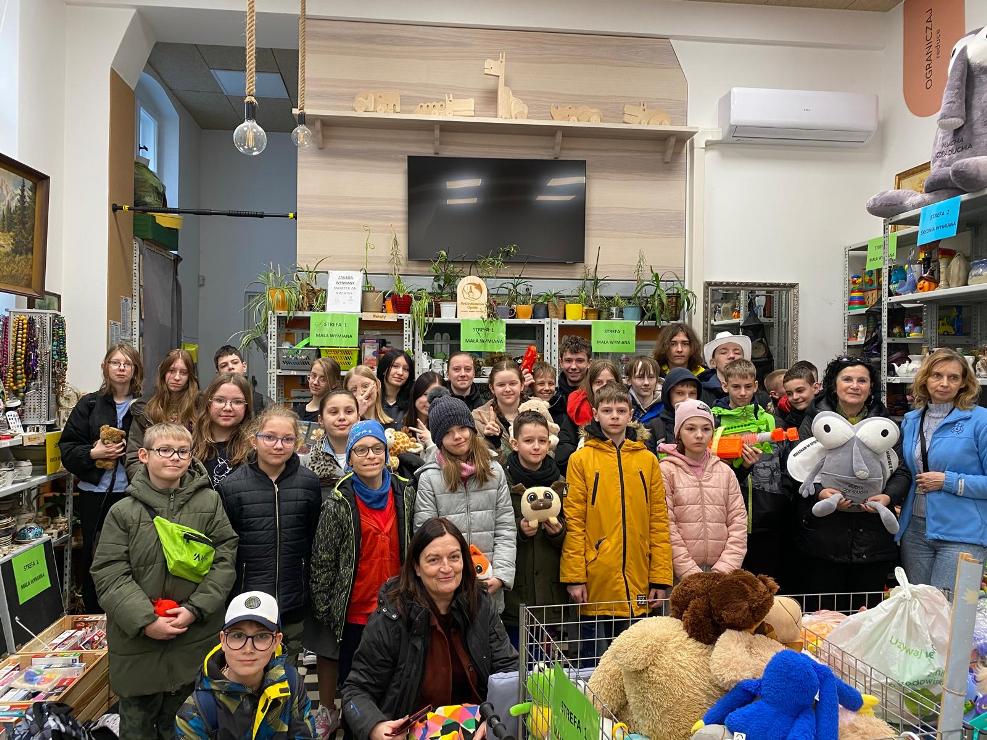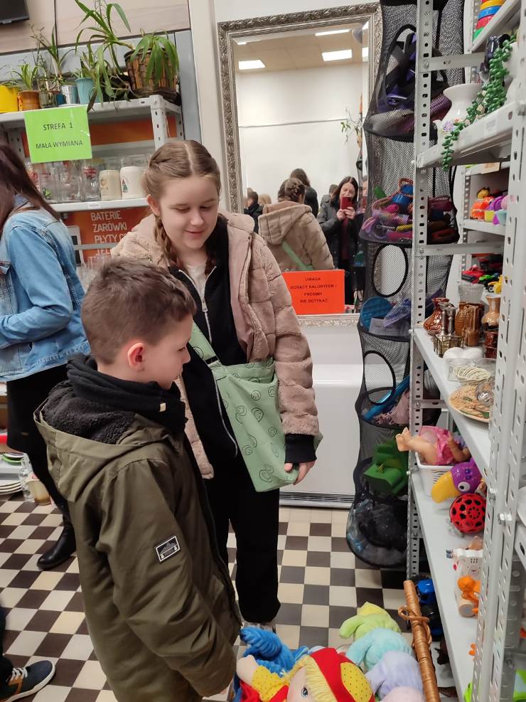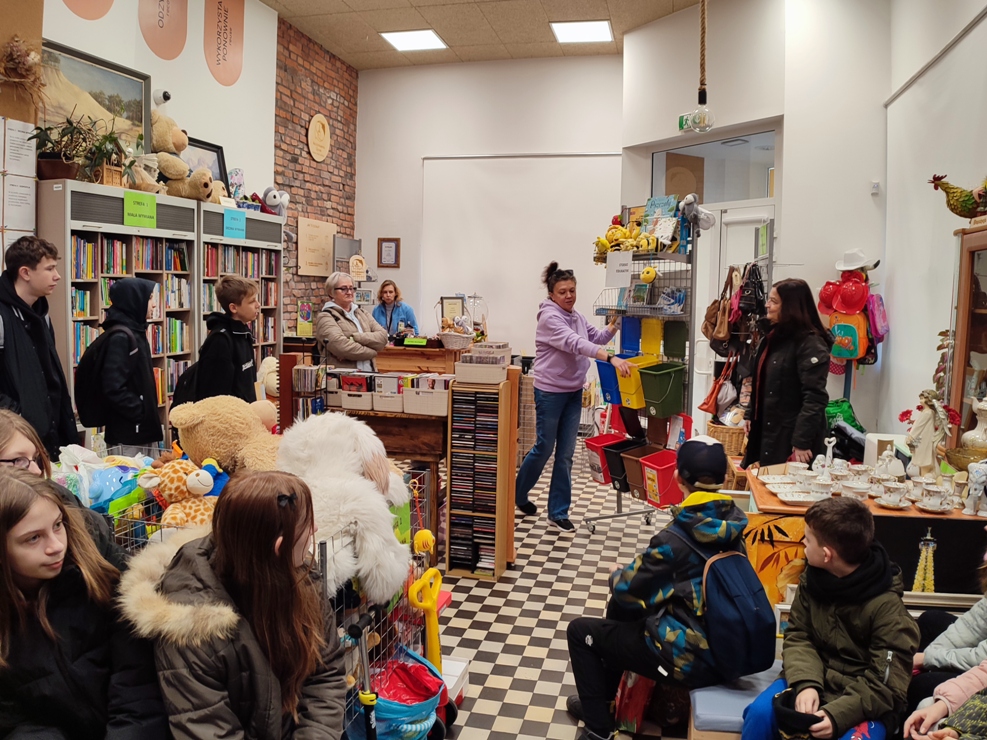 Wcześniej odwiedziliśmy szczególne miejsce-ReUżytkownię w Opolu. Tu uczniowie mogli wymienić przyniesione przez siebie rzeczy, na inne, przyniesione przez kogoś innego. Radości i świetnych wyborów było mnóstwo! Maskotki, książki, skakanki, biżuteria, szklanki, kubki... Miłe Panie z ReUżytkowni opowiedziały o tym miejscu, a także przeprowadziły test-szkolenie z segregacji śmieci z bardzo podchwytliwymi pytaniami. Wszak, 18 marca obchodzimy Światowy Dzień Recyklingu,"który zwraca uwagę na konieczność ochrony naszej planety poprzez zrównoważone zarządzanie zasobami i minimalizowanie odpadów". Uczniowie świetnie poradzili sobie z segregacją, teraz należy jeszcze tych zaleceń przestrzegać w życiu.
