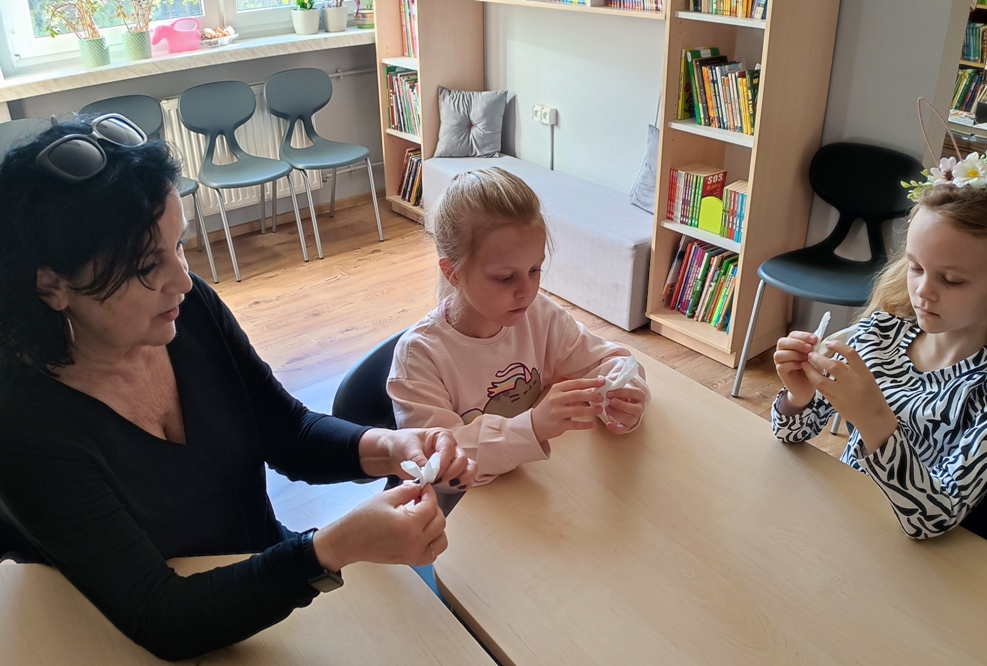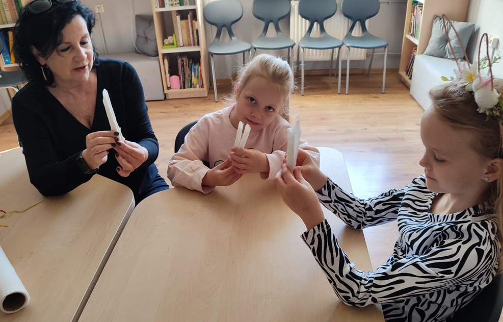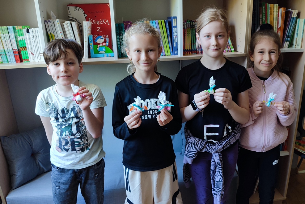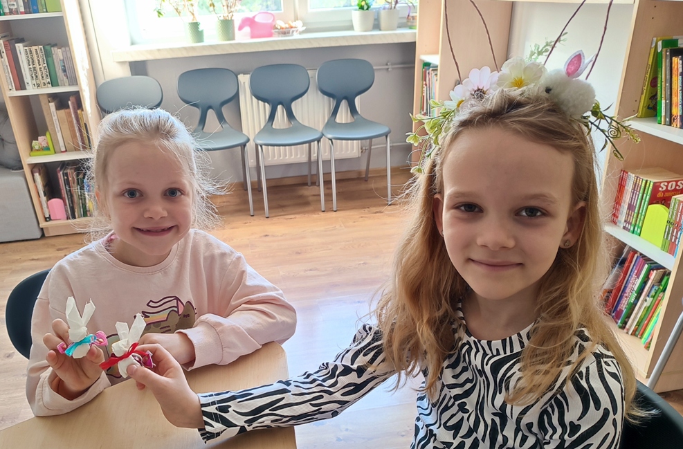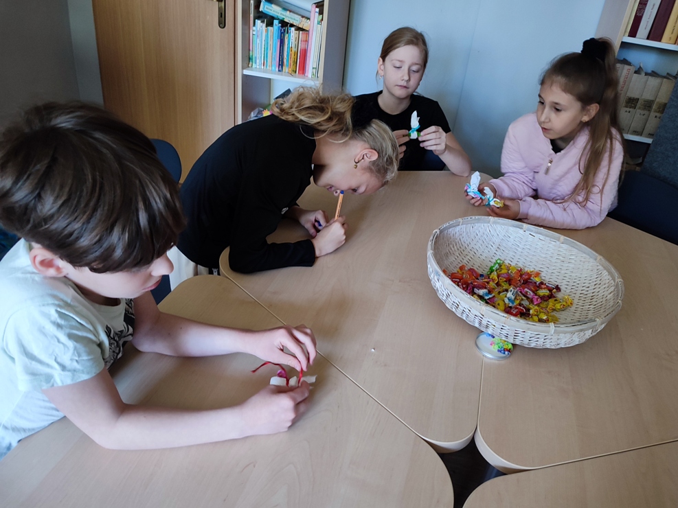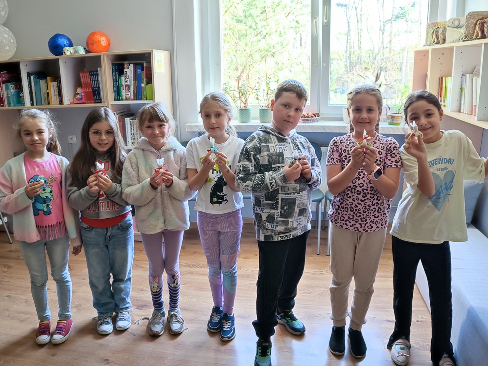 W środę podczas przerw, na szkolnych korytarzach, panował przedświąteczny gwar i rwetes. Niektórzy uczniowie z klas 1-3 w bibliotece znaleźli spokój i ciszę, ale także ciekawe zajęcie. Robiliśmy malutkie, wesołe wielkanocne zajączki z papieru. Z małych kwadratów ręcznika papierowego lub serwetki, gumki recepturki i kolorowej wstążeczki wyszły dzieciom śliczne, maleńkie zajączki, które można samodzielnie wykonać w domu. Jeszcze tylko słodki cukierek do brzuszka zajączka i można nim obdarować innych. Dzieciom bardzo się te przedświąteczne warsztaty podobały, a w bibliotece miło i kreatywnie spędziły czas podczas przerw. Wesołych świąt!