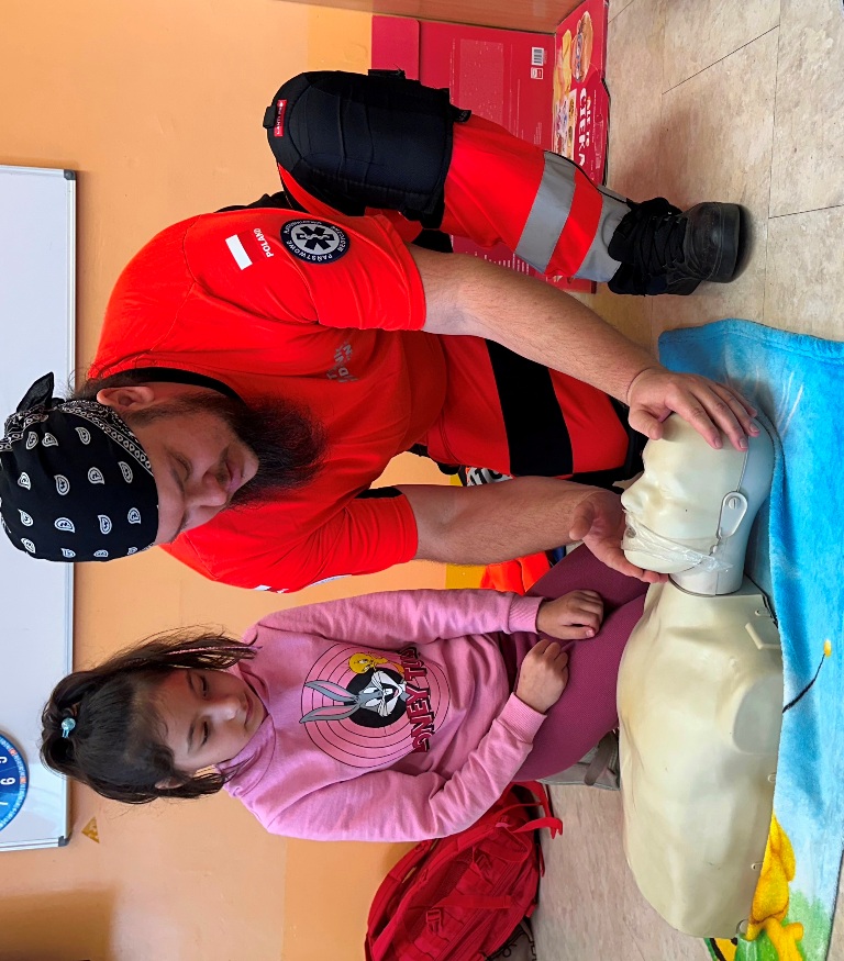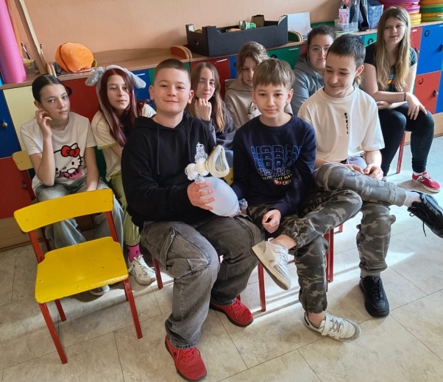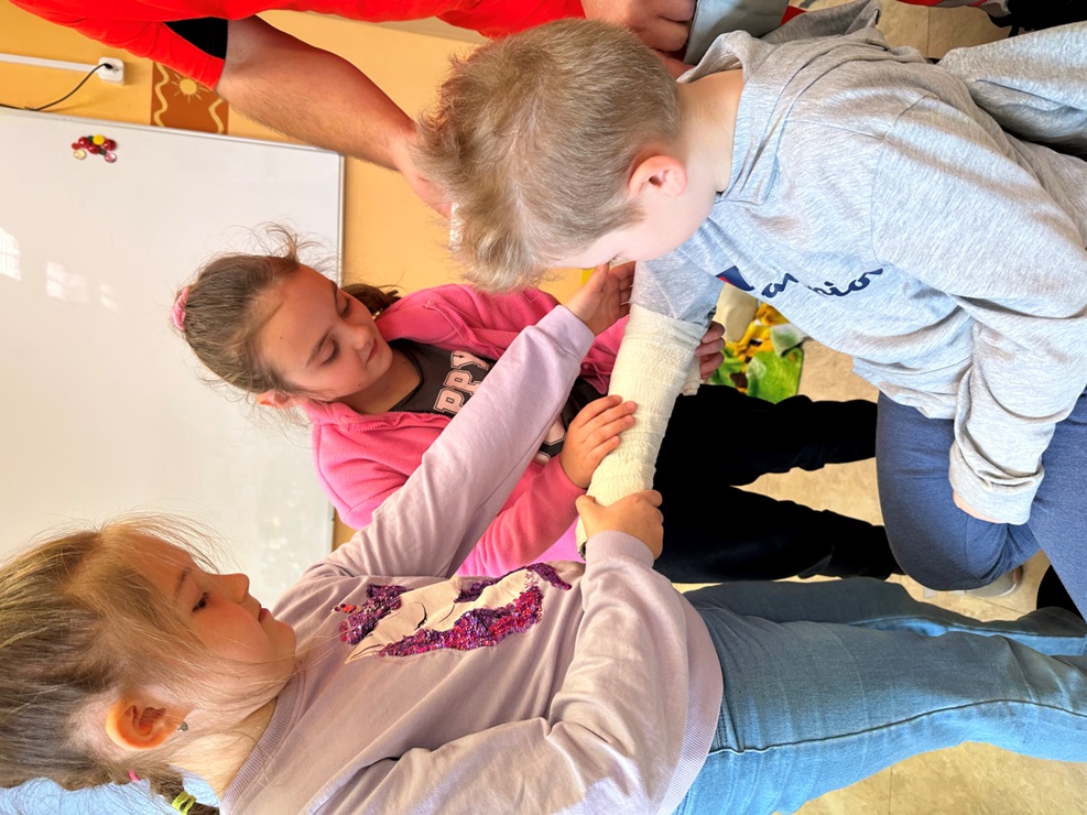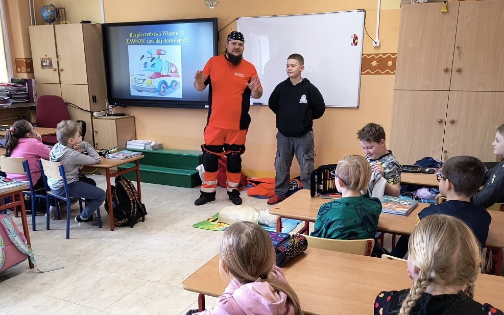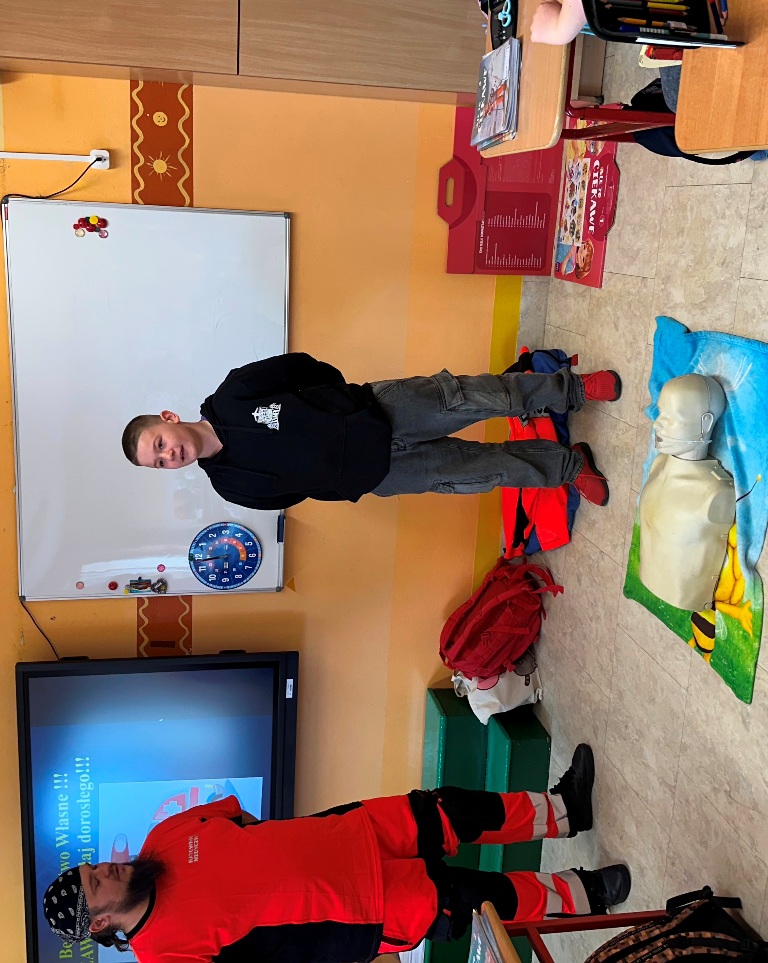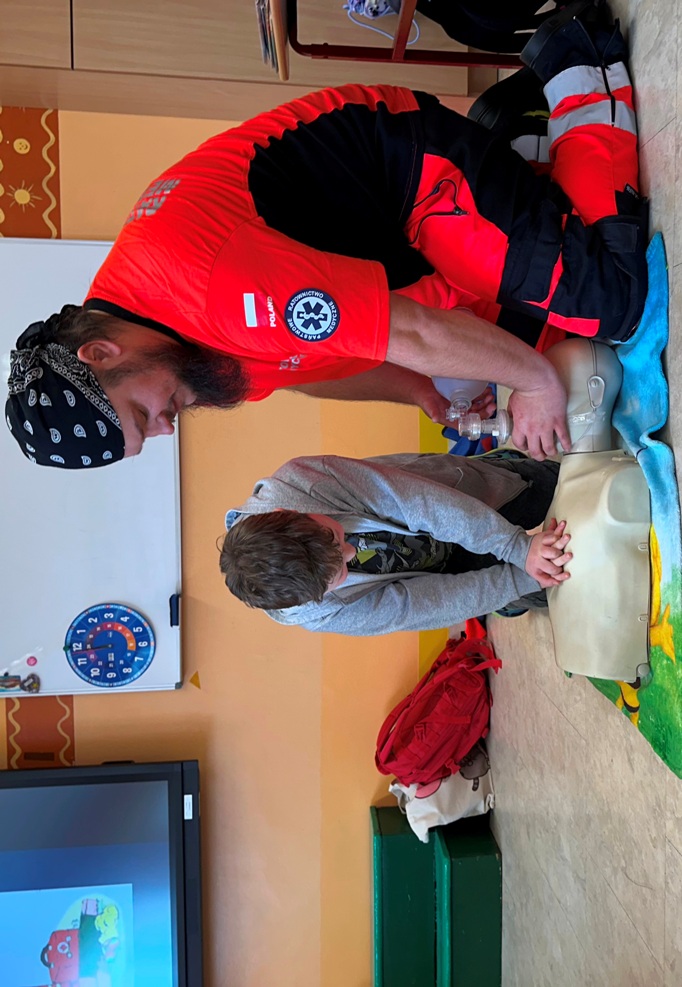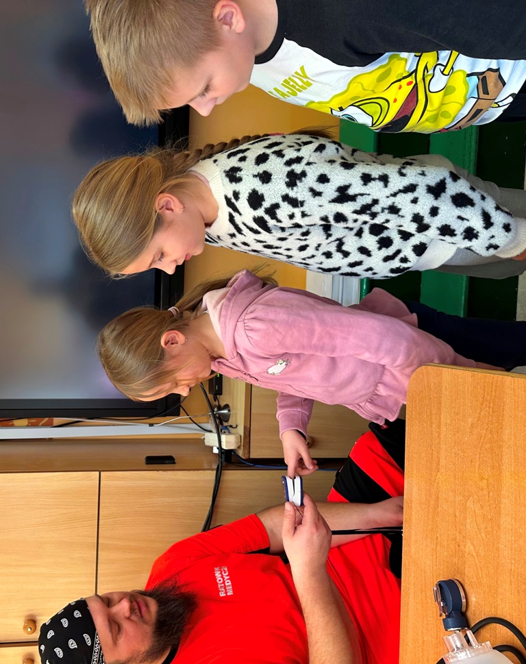W marcu uczniowie klasy 2a i 5a w ramach innowacji pedagogicznej z zakresu pierwszej pomocy mieli okazję spotkać się z ratownikiem medycznym Panem Łukaszem Klaczką. W trakcie spotkania dzieci zostały zapoznane z pracą ratownika medycznego i sposobami pomocy w różnych sytuacjach wymagających interwencji służb medycznych. Uczniowie mieli możliwość ćwiczyć na fantomie do pierwszej pomocy z czego bardzo chętnie skorzystali. Ponadto mogli wykonać opatrunki medyczne, zmierzyć temperaturę, obejrzeć resuscytator – worek samorozprężalny do sztucznej wentylacji (worek AMBU), który stosowany jest w ratownictwie oraz w szpitalach. Na zakończenie spotkania dzieci zadawały pytania panu ratownikowi.