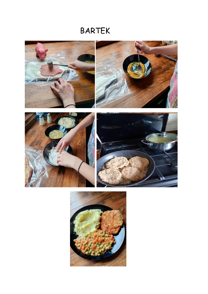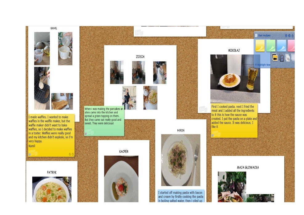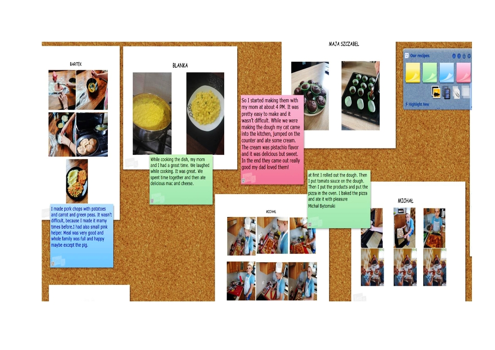 W ramach innowacji z języka angielskiego uczniowie stworzyli przepisy przepysznych dań w języku angielskim, następnie wylosowali potrawę i… ugotowali ją w domu. Zdjęcia przygotowanych dań młodzi kucharze zamieścili na specjalnej platformie wraz z opisem swoich wrażeń – oczywiście po angielsku.