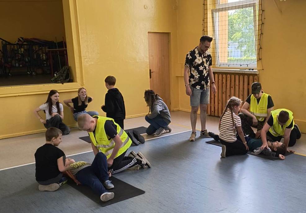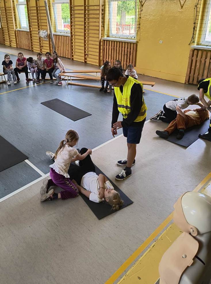 W dniu 10.06.2025 klasy 2a i 5a uczestniczyły w kolejnych zajęciach w ramach innowacji „Uczymy się ratować i ratujemy” prowadzonej w szkole przez panie Agnieszkę Kaczmarek i Darię Bejm. Tym razem uczniowie mieli okazję uczestniczyć w zajęciach poprowadzonych przez Szkolną Grupę Zabezpieczenia Medycznego, pod kierunkiem pana Adriana Białka.