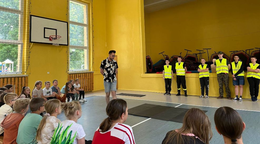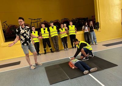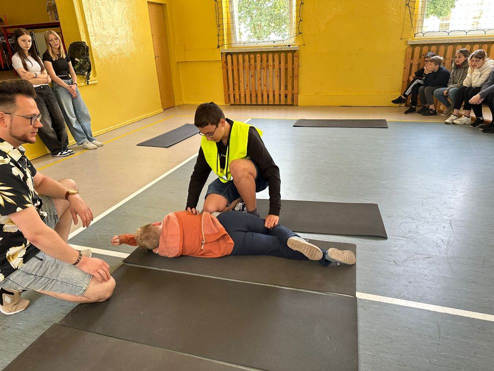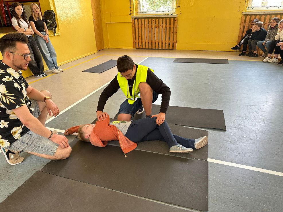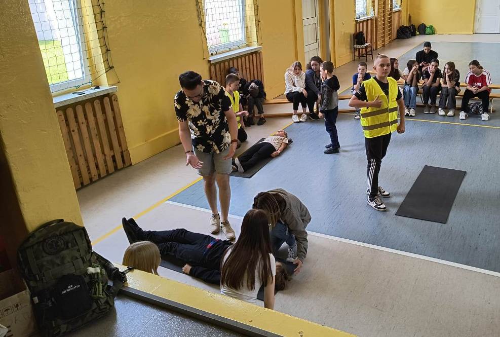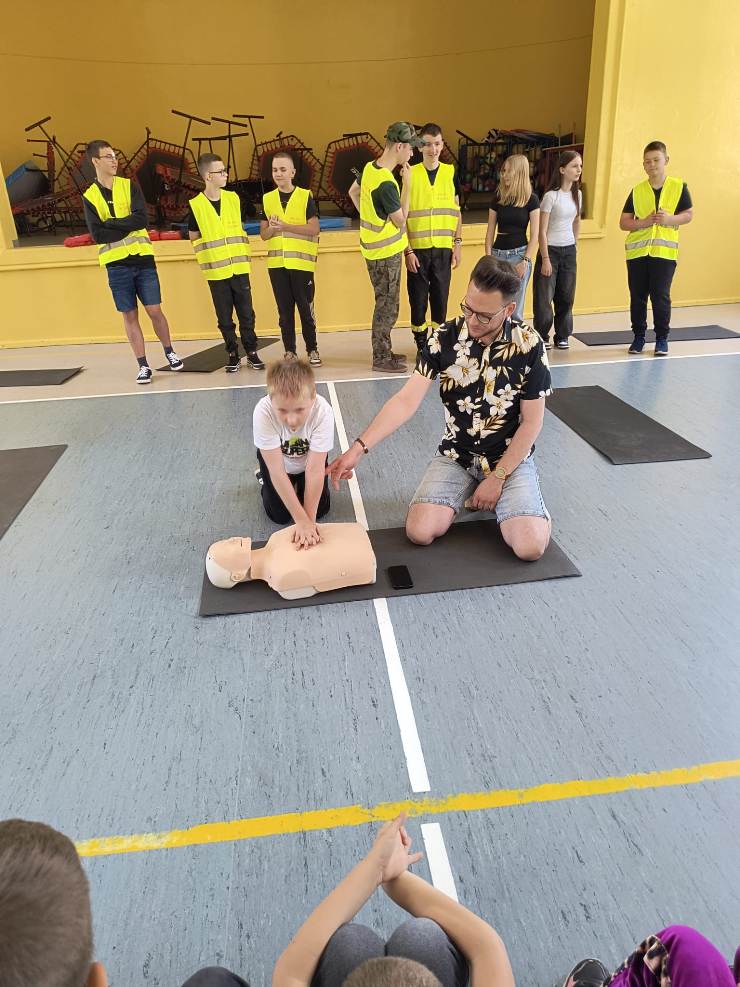 W czasie spotkania uczniowie zostali zapoznani z procedurami i sposobem postępowania na miejscu zdarzenia, a także ze sposobem postępowania z poszkodowanym nieprzytomnym oddychającym oraz nieprzytomnym bez wyczuwalnego oddechu. Mieli okazję przećwiczyć, jak należy sprawdzić oddech u osoby nieprzytomnej, ułożyć poszkodowanego w pozycji bocznej bezpiecznej oraz wykonać resuscytację krążeniowo-oddechową na fantomie. Pod bacznym okiem pana Białka uczniowie klas młodszych w asyście starszych kolegów wykonywali wszystkie ćwiczenia. Wszyscy z dużym zaangażowaniem i zainteresowaniem uczestniczyli w tych bardzo ciekawych zajęciach.