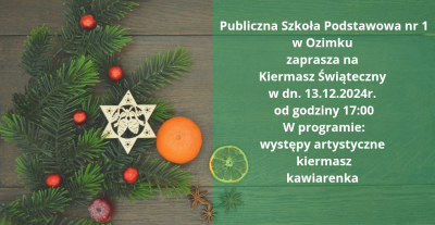 Już w piątek, 13 grudnia o godz. 17.00, zapraszamy do Publicznej Szkoły Podstawowej nr 1 w Ozimku na Kiermasz Świateczny, występy dzieci oraz pyszne domowe ciasta i aromatyczną kawę.
