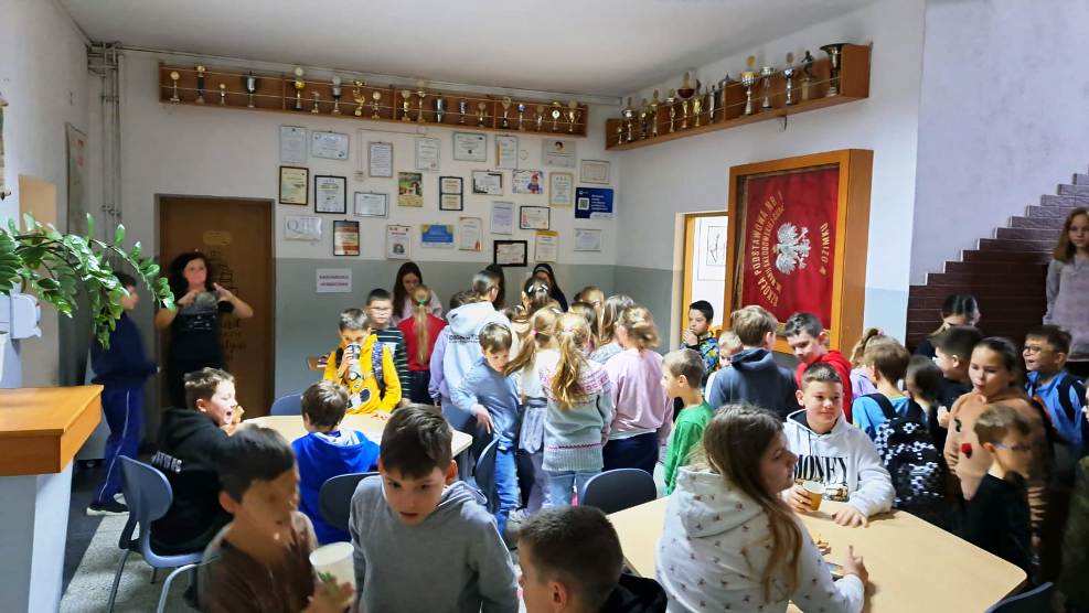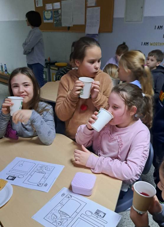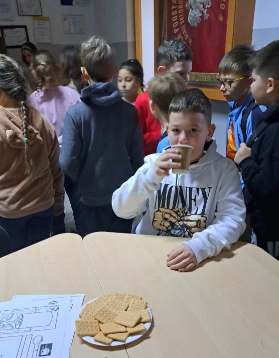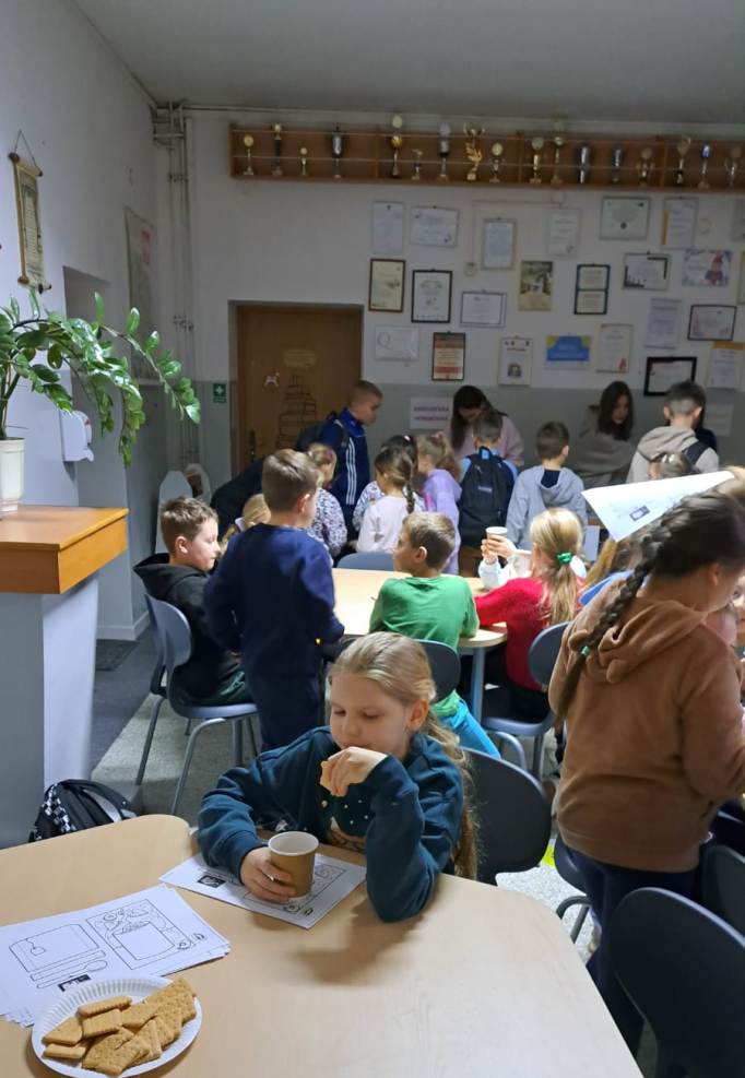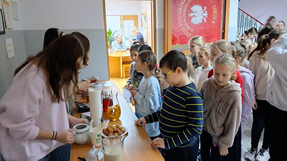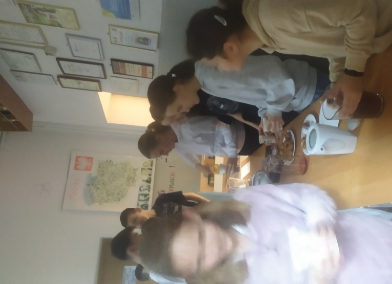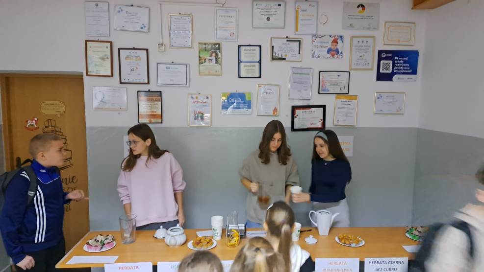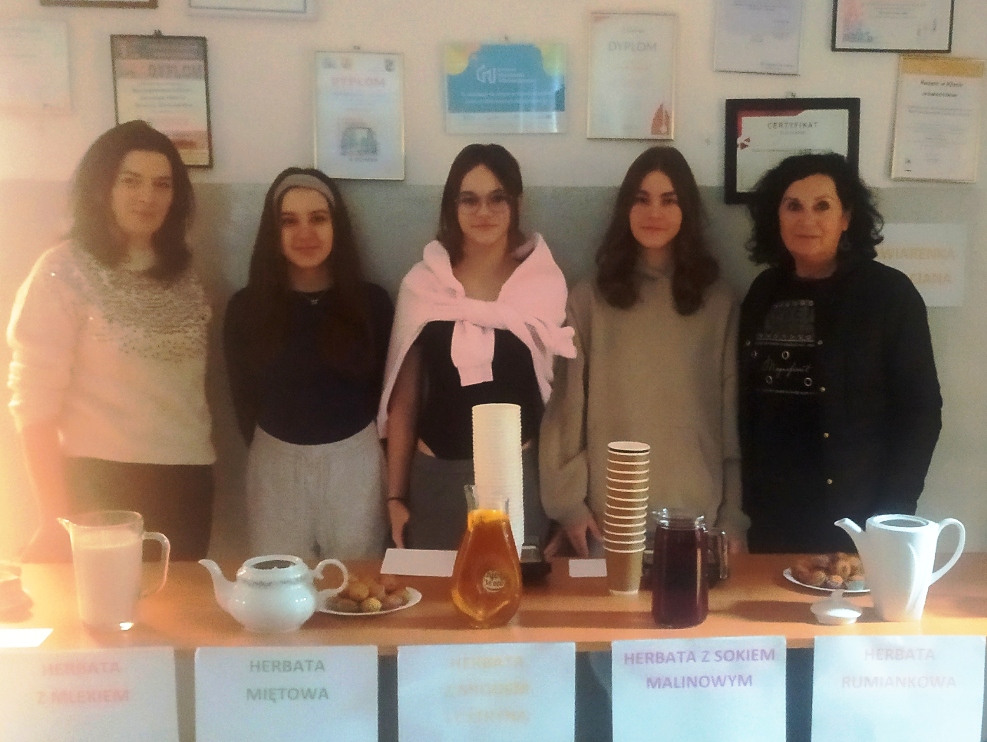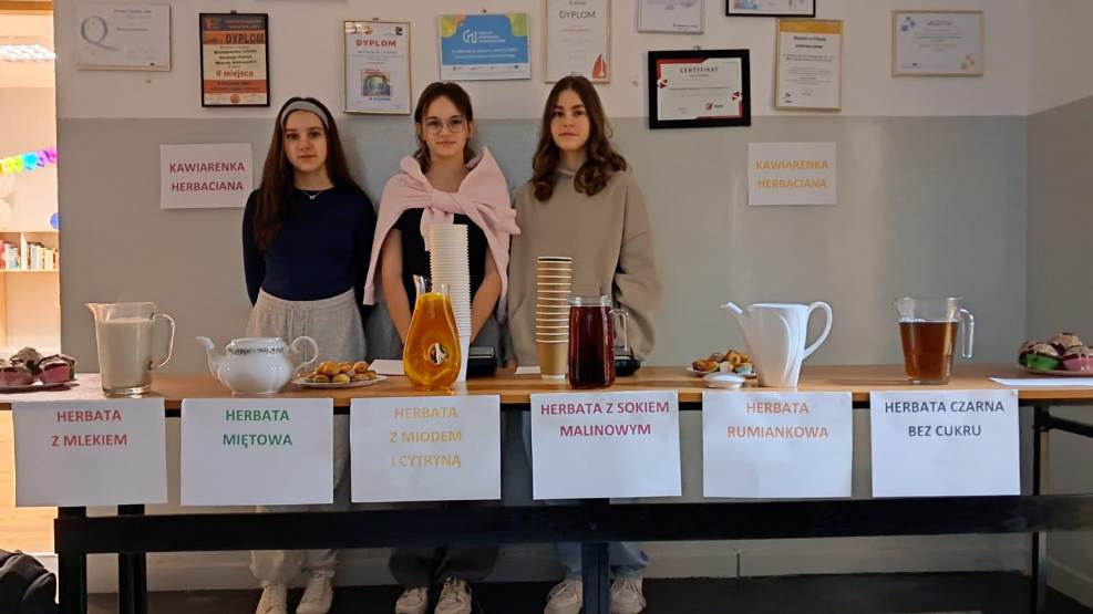 Nasze dziewczęta z klasy ósmej: Aniela Bobulska, Julia Krawczuk, Zuzia Mirowska przygotowały herbaty dla uczniów. A ponieważ każdy z nas jest inny, to i herbaty były różnorodne: herbata  z sokiem malinowym, herbata miętowa, herbata rumiankowa, herbata z miodem i cytryną,  herbata z mlekiem oraz  herbata czarna bez cukru. Uczniom najbardziej smakowała herbata z miodem i cytryną, do której świetnie smakowały herbatniki. Nasza szkolna  "kawiarenka herbaciana" miała bardzo duże powodzenie, a do herbatek serwowanych przez uśmiechnięte uczennice, ustawiały się na przerwach długie kolejki. A jaką herbatę Wy lubicie najbardziej?