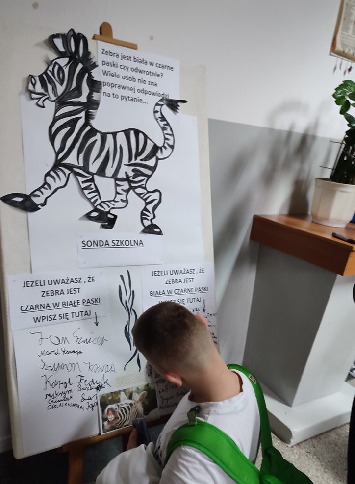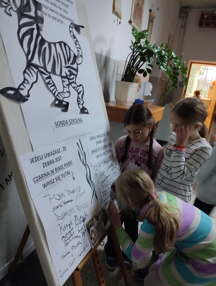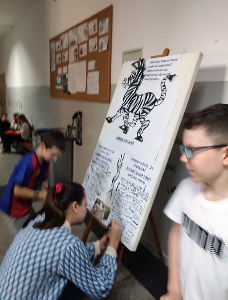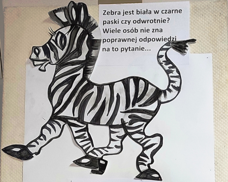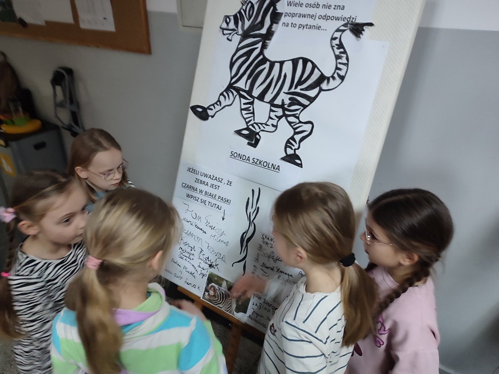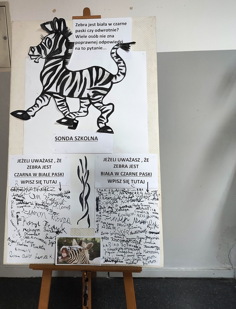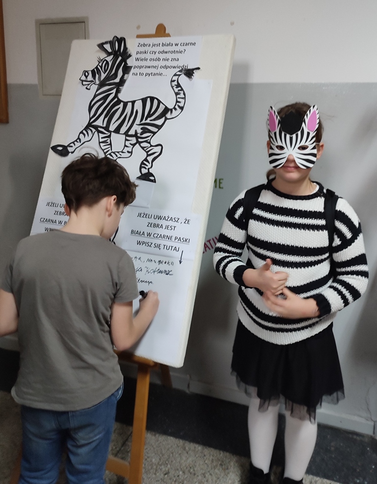 Przeprowadziliśmy także szkolną sondę: czy zebra jest biała w czarne paski, czy czarna w białe paski? Wygrała opcja "biała w czarne paski", ale każdy może mieć swoje zdanie na ten temat. Sonda cieszyła się dużym zainteresowaniem wśród naszych uczniów, który włączyli się w obchody tego nietypowego i wesołego święta.