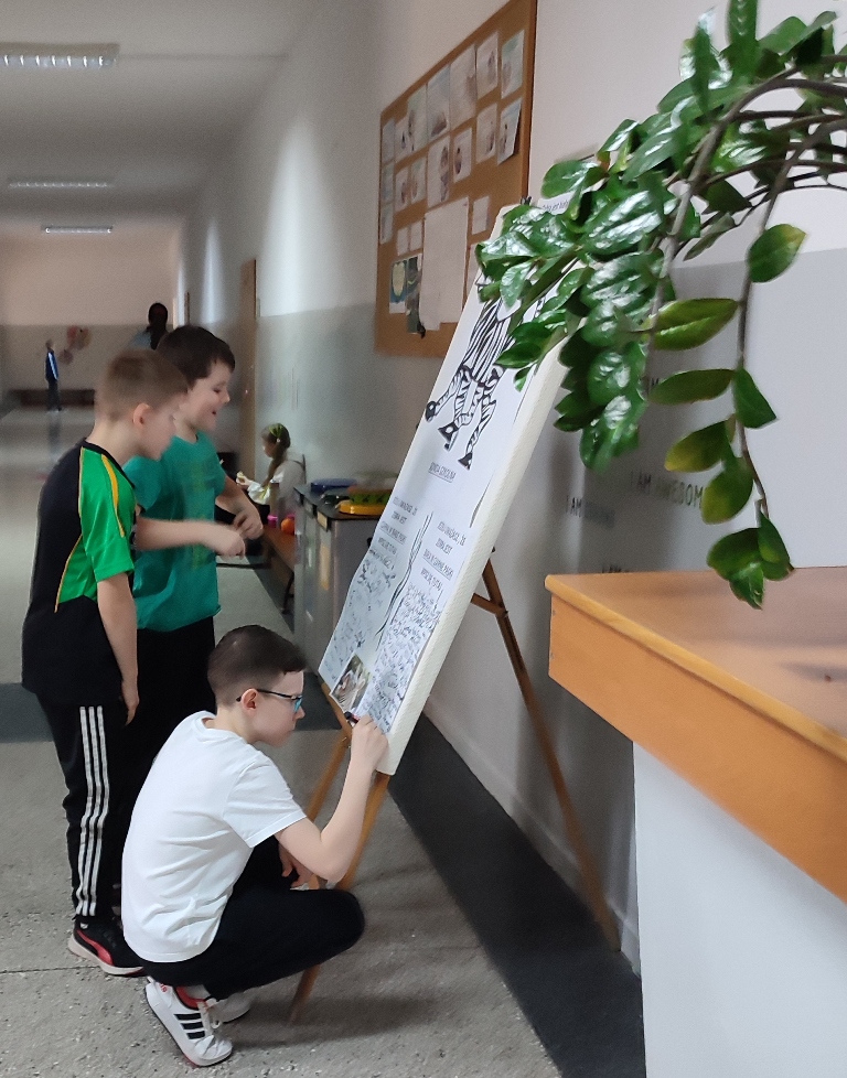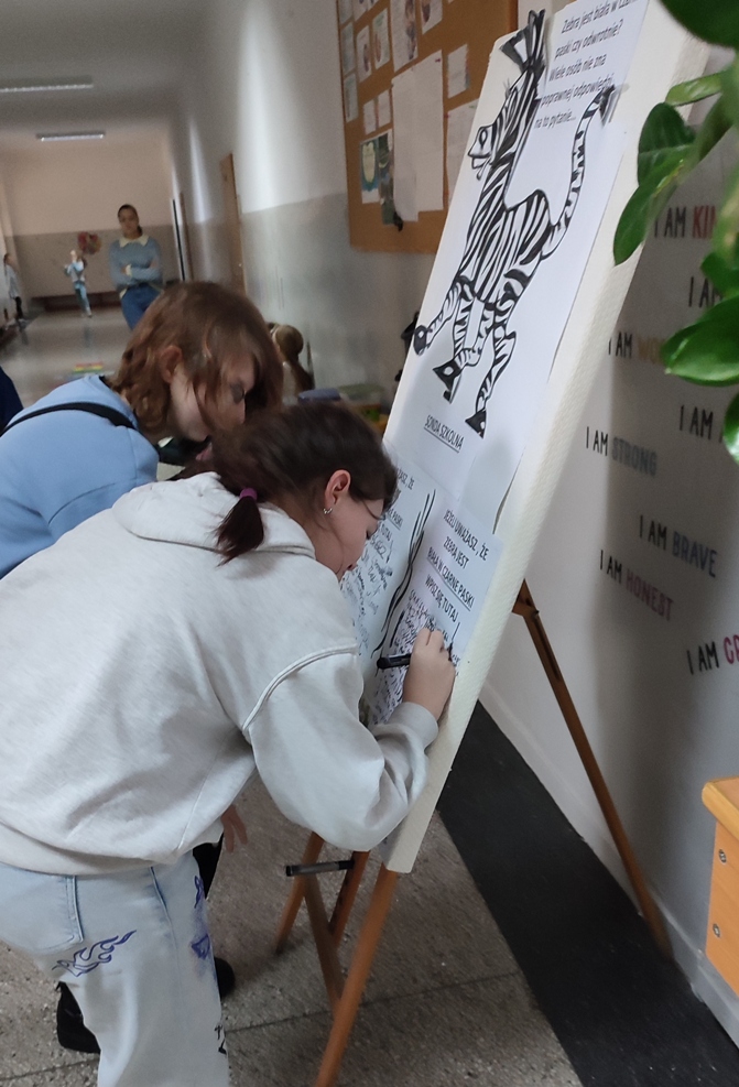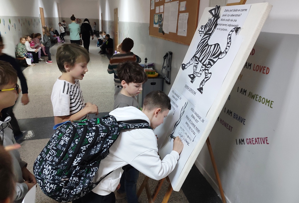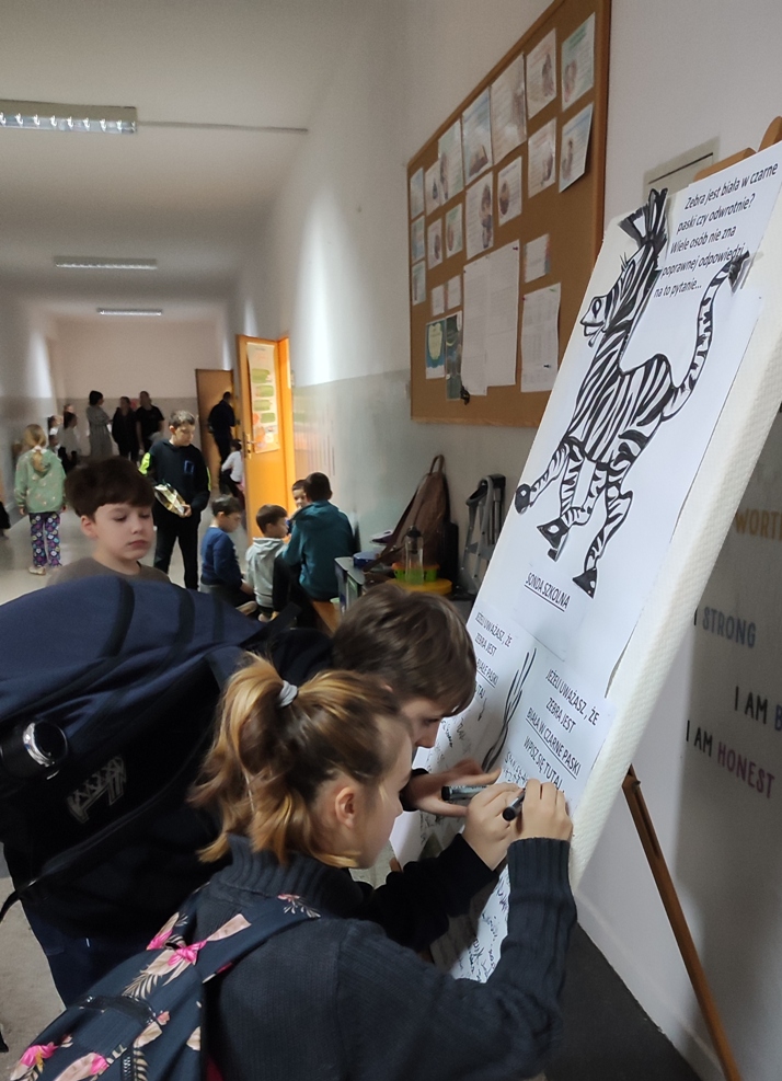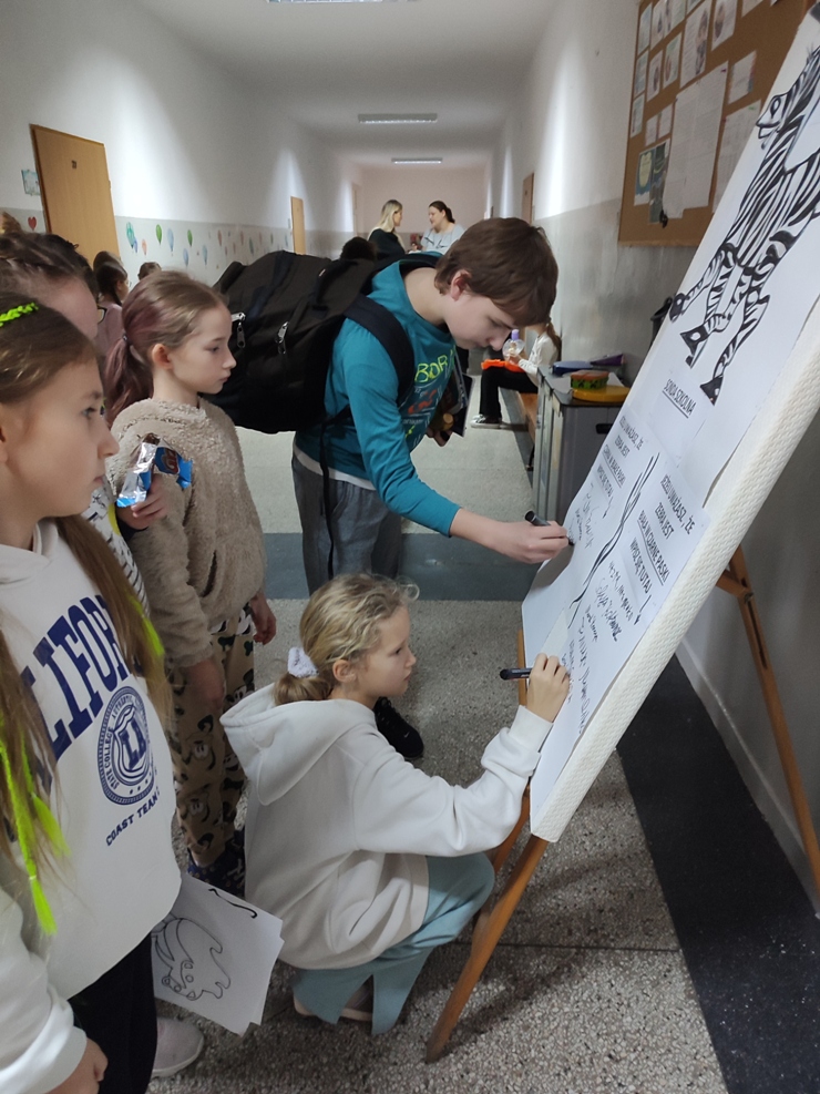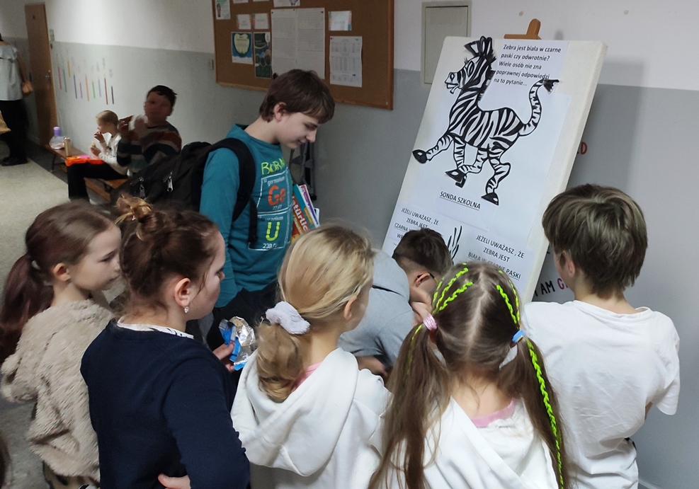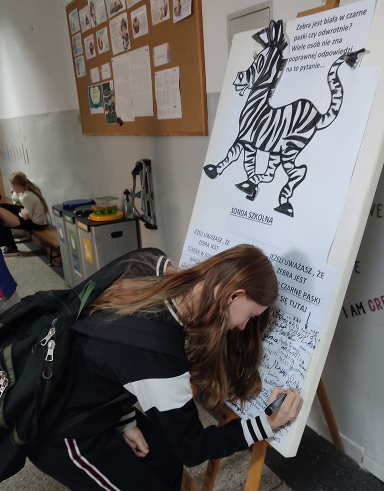 Przeprowadziliśmy także szkolną sondę: czy zebra jest biała w czarne paski, czy czarna w białe paski? Wygrała opcja "biała w czarne paski", ale każdy może mieć swoje zdanie na ten temat. Sonda cieszyła się dużym zainteresowaniem wśród naszych uczniów, który włączyli się w obchody tego nietypowego i wesołego święta.