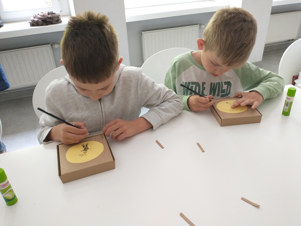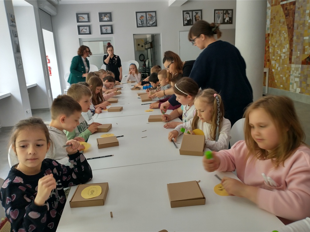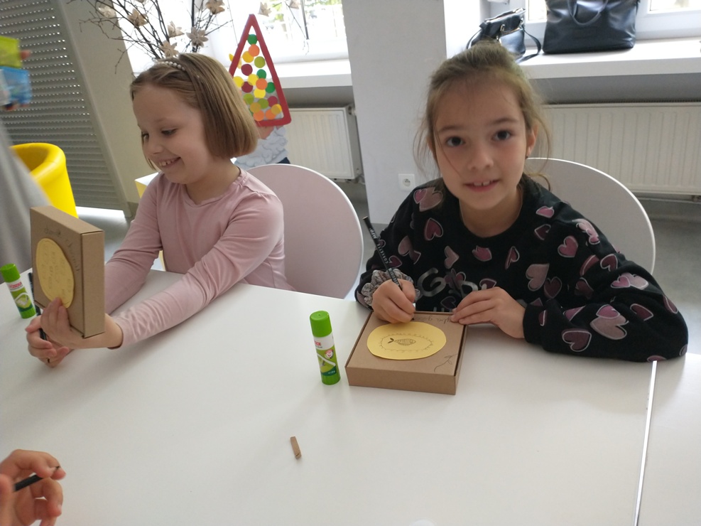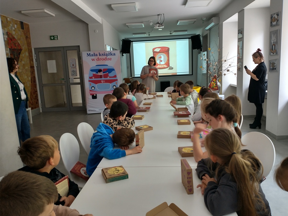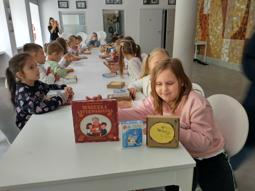 7 maja uczniowie klasy pierwszej uczestniczyli w warsztatach czytelniczych w Miejskiej i Gminnej Bibliotece Publicznej w Ozimku, które poprowadziły dwie niezwykłe panie z „Tu Czytamy” - Magda Biedrończyk i Agnieszka Blazy.  Warsztaty  były oparte na pięknej książce Justyny Bednarek pt. „Wnuczka antykwariusza”, którą uczniowie otrzymali w ramach kampanii społecznej „Mała książka – wielki człowiek”. Słuchając fragmentów książki uczniowie mieli okazję przenieść się w świat Gabrysi, tytułowej bohaterki opowieści i poznać ciekawe i niezwykłe rodzinne historie w niej opisane.  Następnie dzieci wykonały swoje własne pudełka wspomnień, w których będą mogli zbierać własne pamiątki i wspomnienia.  Na zakończenie każde dziecko otrzymało upominek- puzzle.