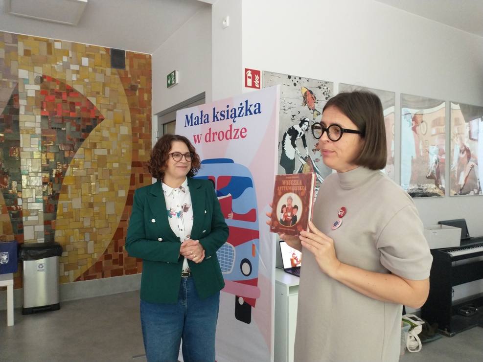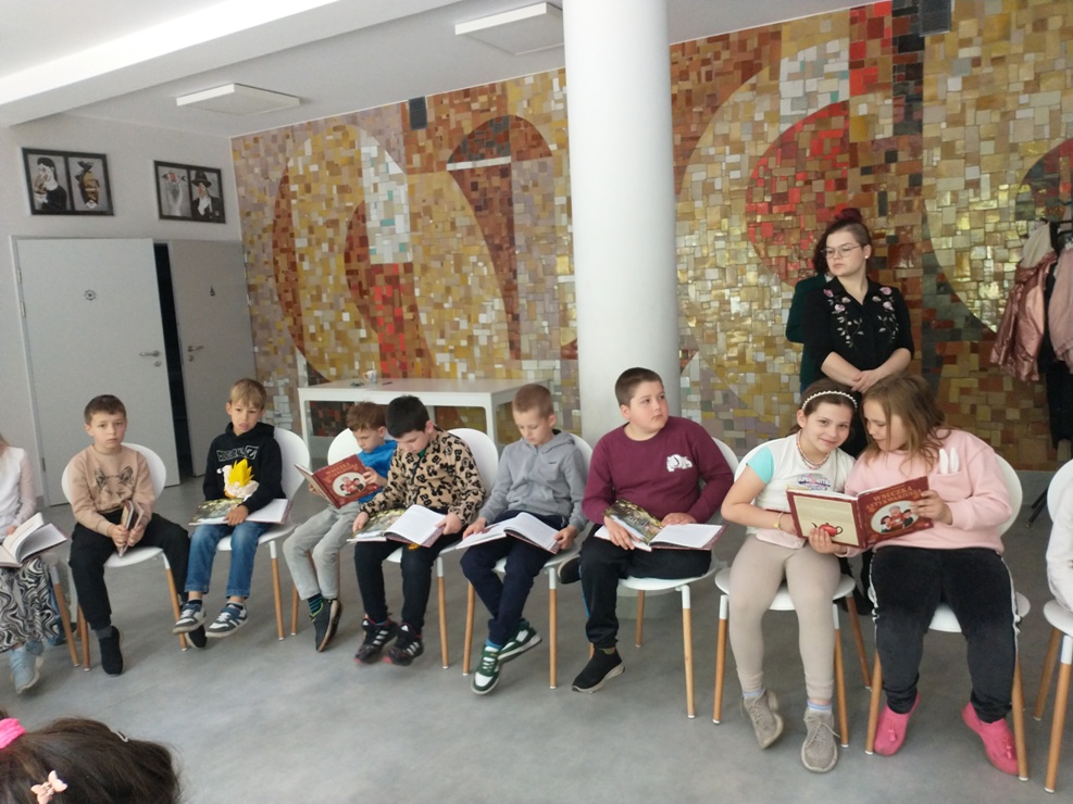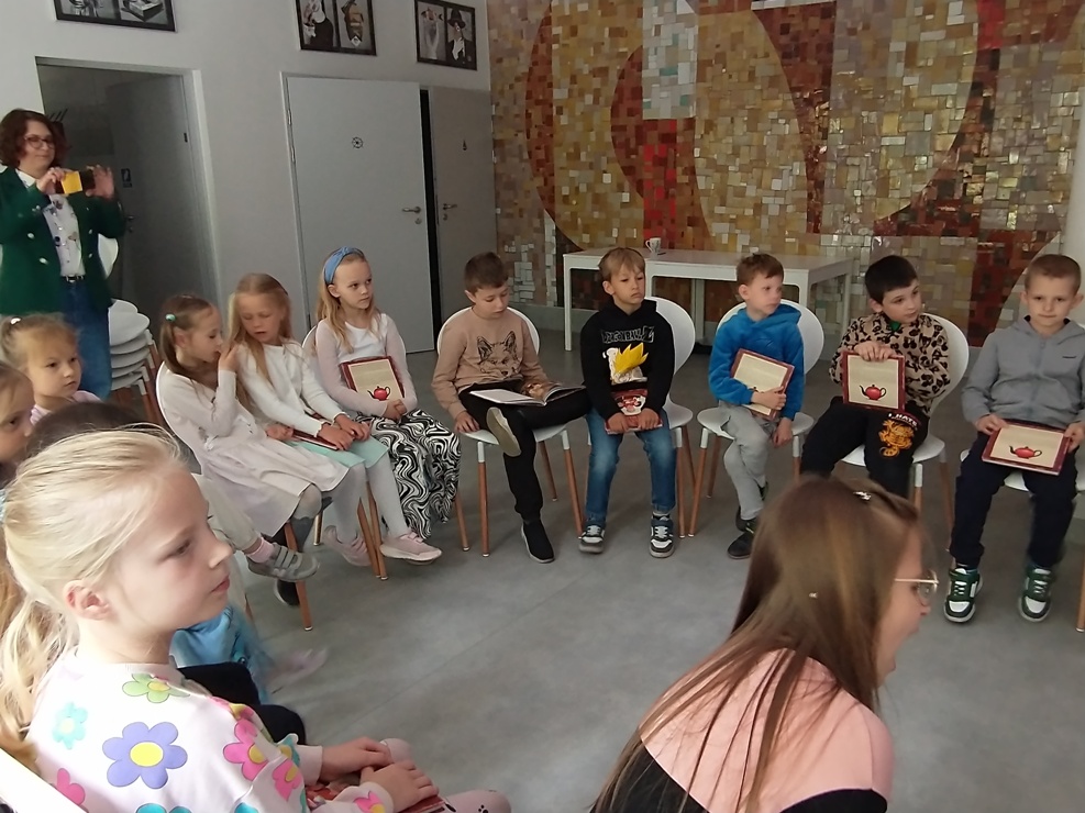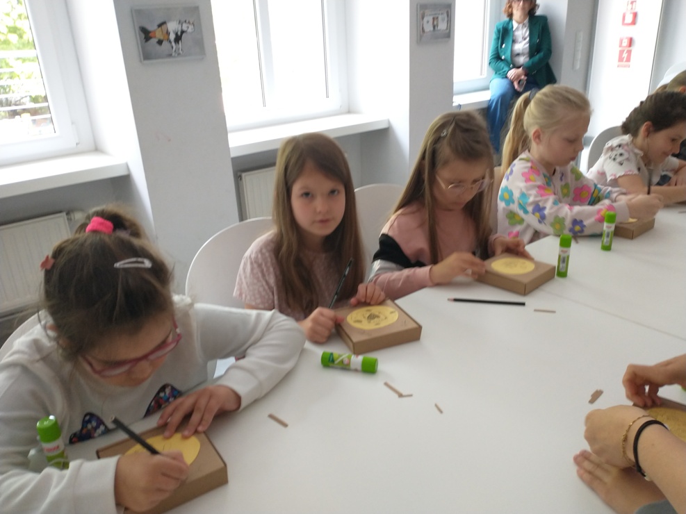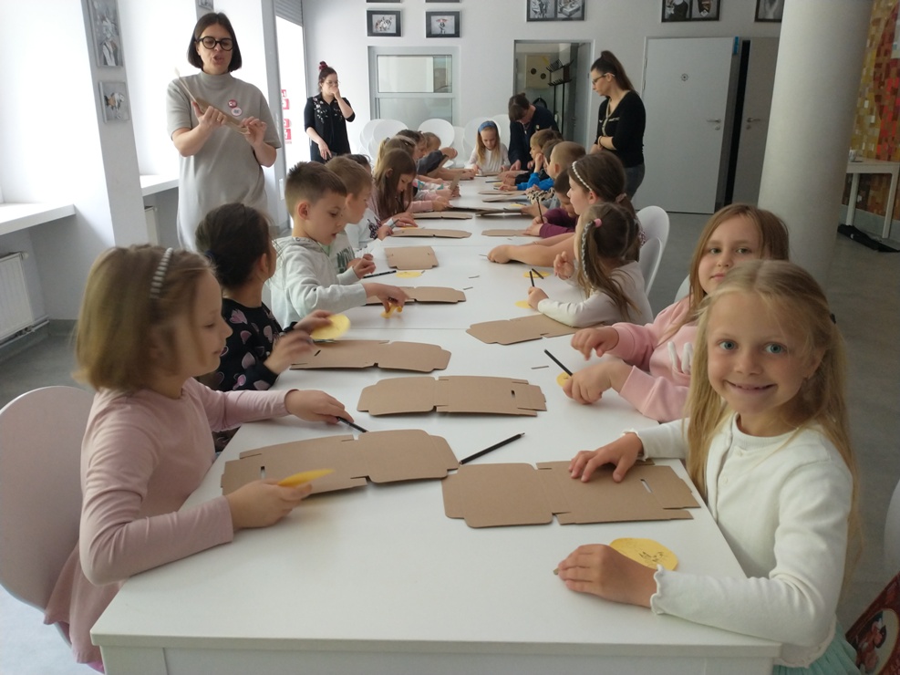 7 maja uczniowie klasy pierwszej uczestniczyli w warsztatach czytelniczych w Miejskiej i Gminnej Bibliotece Publicznej w Ozimku, które poprowadziły dwie niezwykłe panie z „Tu Czytamy” - Magda Biedrończyk i Agnieszka Blazy.  Warsztaty  były oparte na pięknej książce Justyny Bednarek pt. „Wnuczka antykwariusza”, którą uczniowie otrzymali w ramach kampanii społecznej „Mała książka – wielki człowiek”. Słuchając fragmentów książki uczniowie mieli okazję przenieść się w świat Gabrysi, tytułowej bohaterki opowieści i poznać ciekawe i niezwykłe rodzinne historie w niej opisane.  Następnie dzieci wykonały swoje własne pudełka wspomnień, w których będą mogli zbierać własne pamiątki i wspomnienia.  Na zakończenie każde dziecko otrzymało upominek- puzzle.