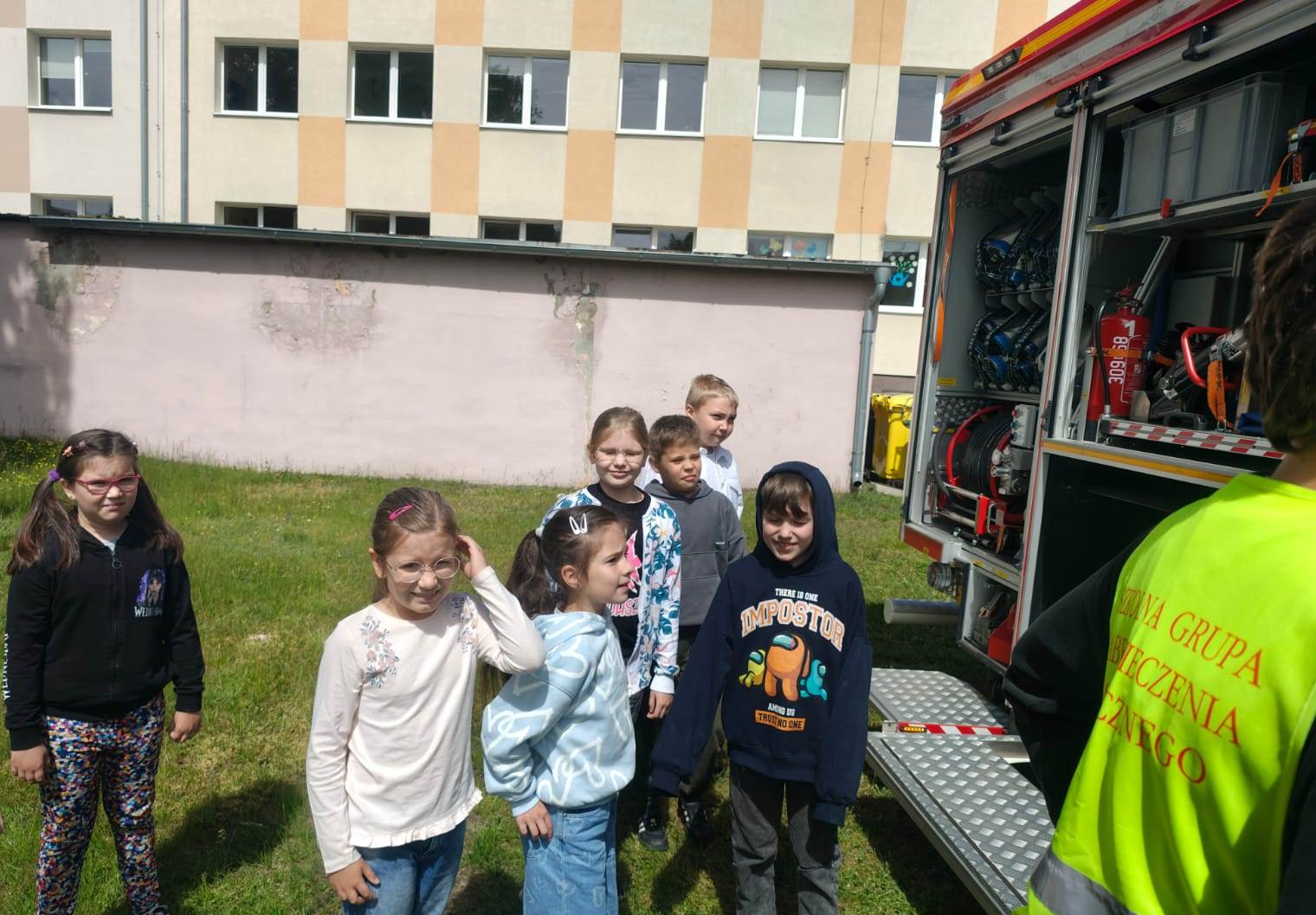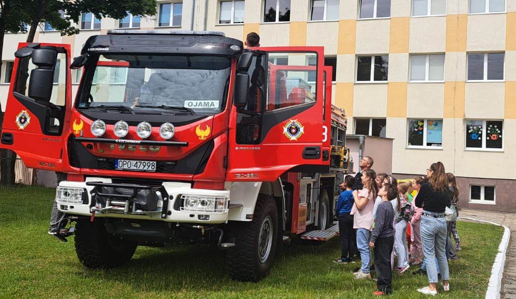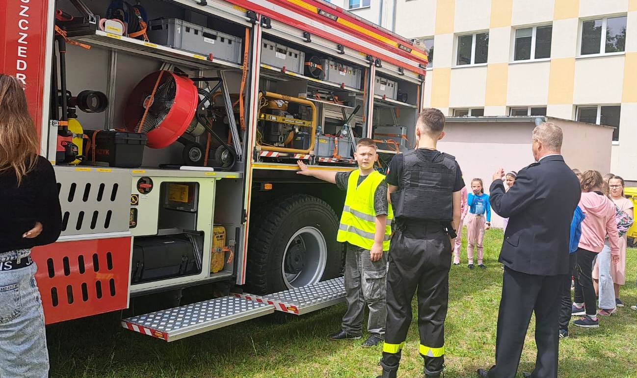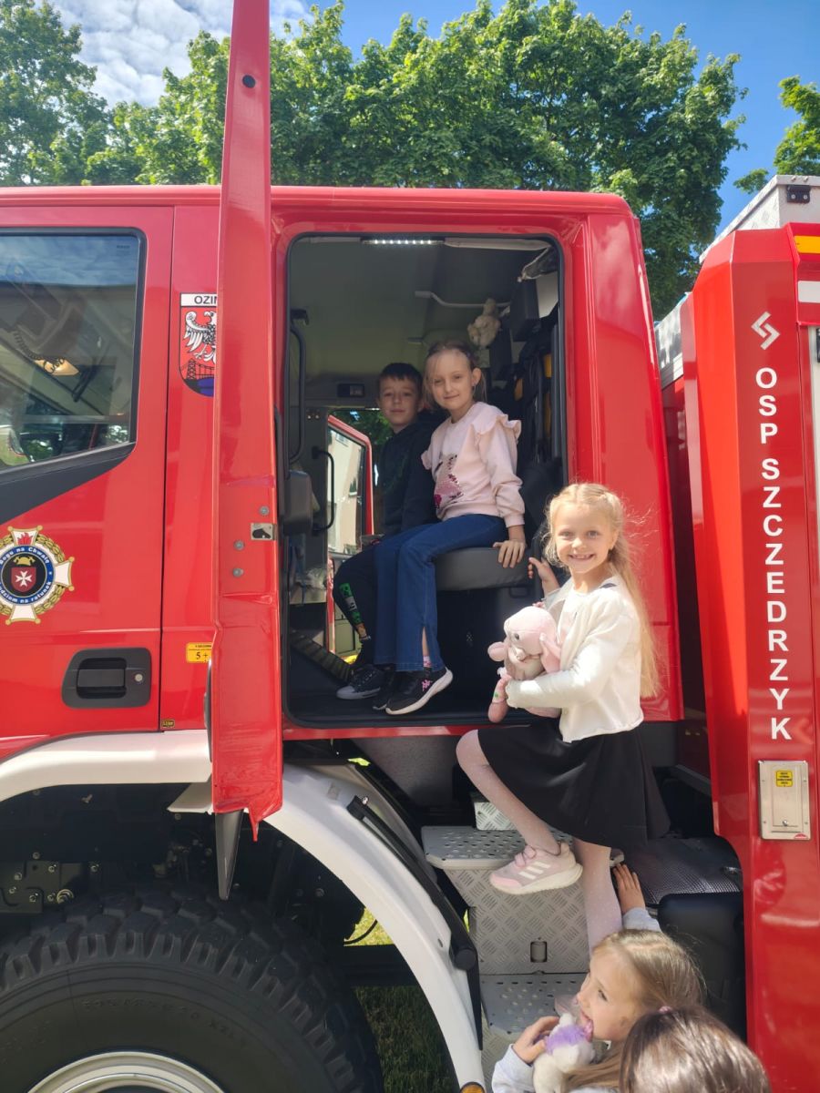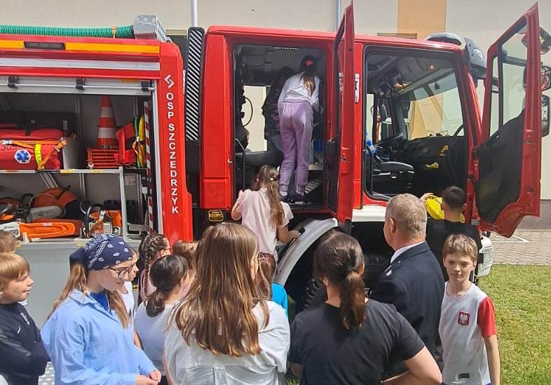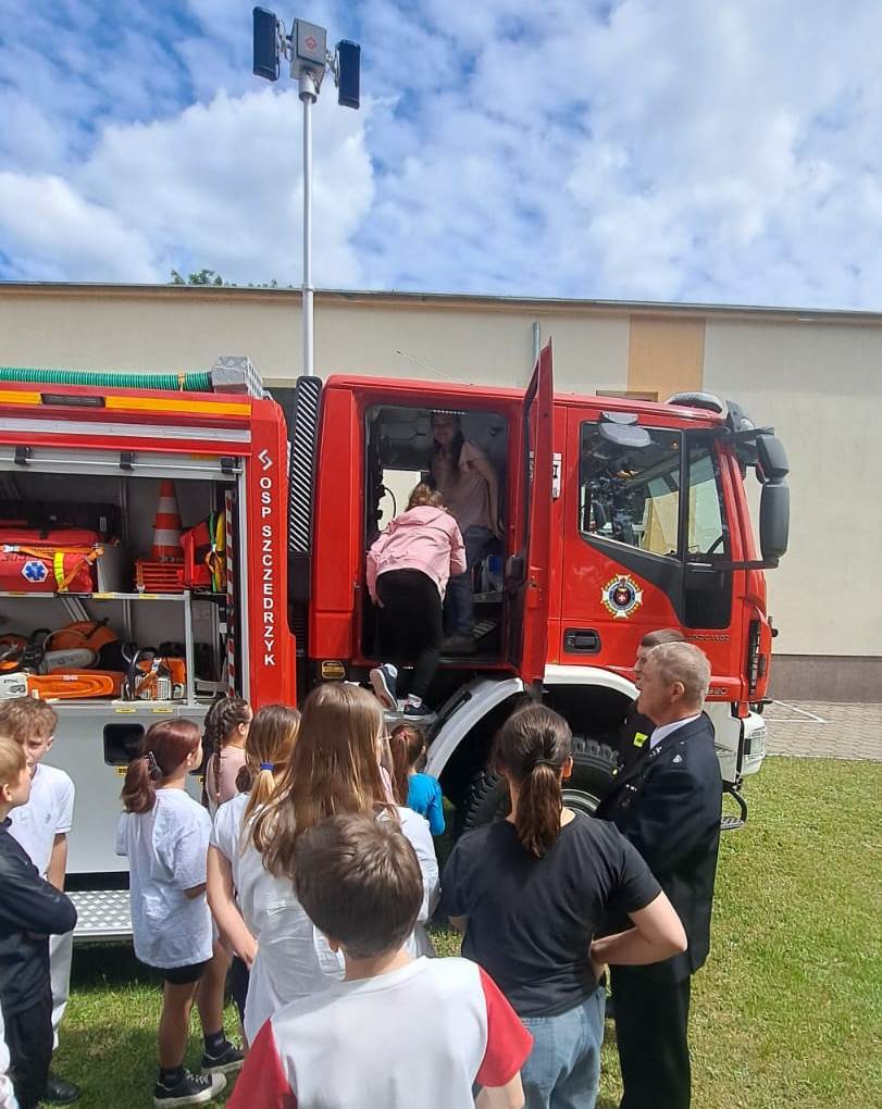 Uczniowie naszej szkoły mogli zobaczyć strażacki wóz bojowy z Ochotniczej Straży Pożarnej w Szczedrzyku. Prezes OSP Szczedrzyk, Druh Andrzej Jakubiec, z ogromną cierpliwością pokazywał wszystkie zakamarki auta i opowiadał, do czego poszczególny sprzęt jest potrzebny. Pomagał mu w tym wnuk Wiktor, który działa w Szkolnej Grupie Zabezpieczenia Medycznego i jest adeptem pożarnictwa. Na  dzieciach i młodzieży wóz zrobił ogromne wrażenie. Nic dziwnego, ten czerwony kolos na kołach jest po prostu wspaniały! Dziękujemy!