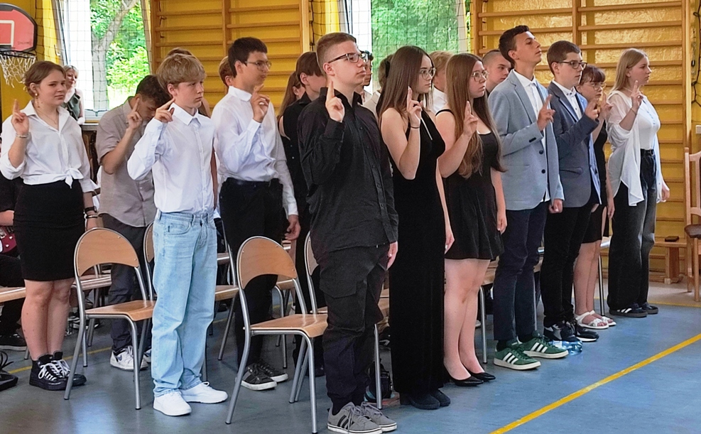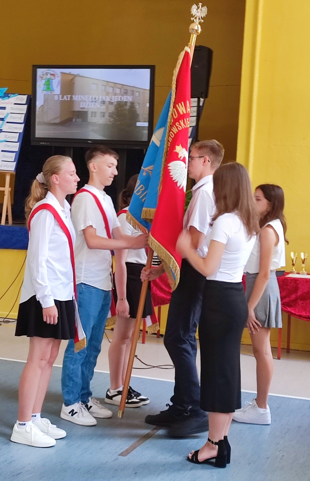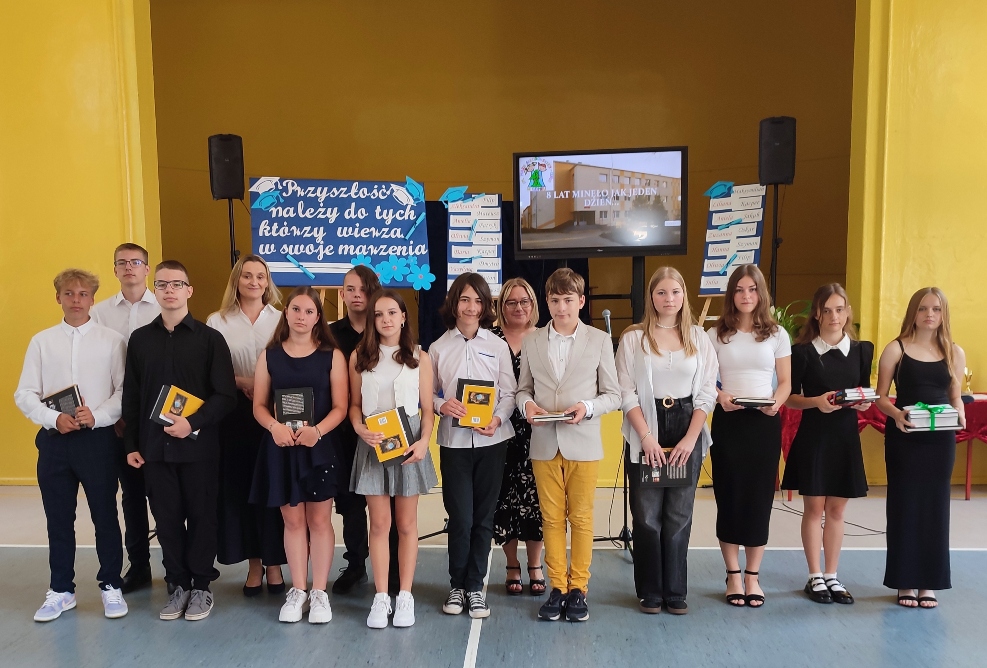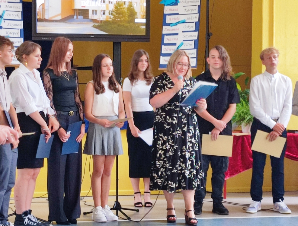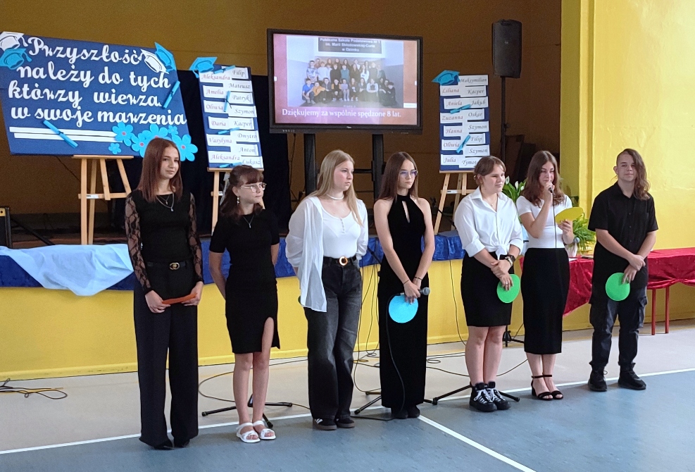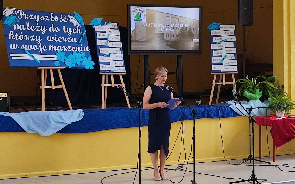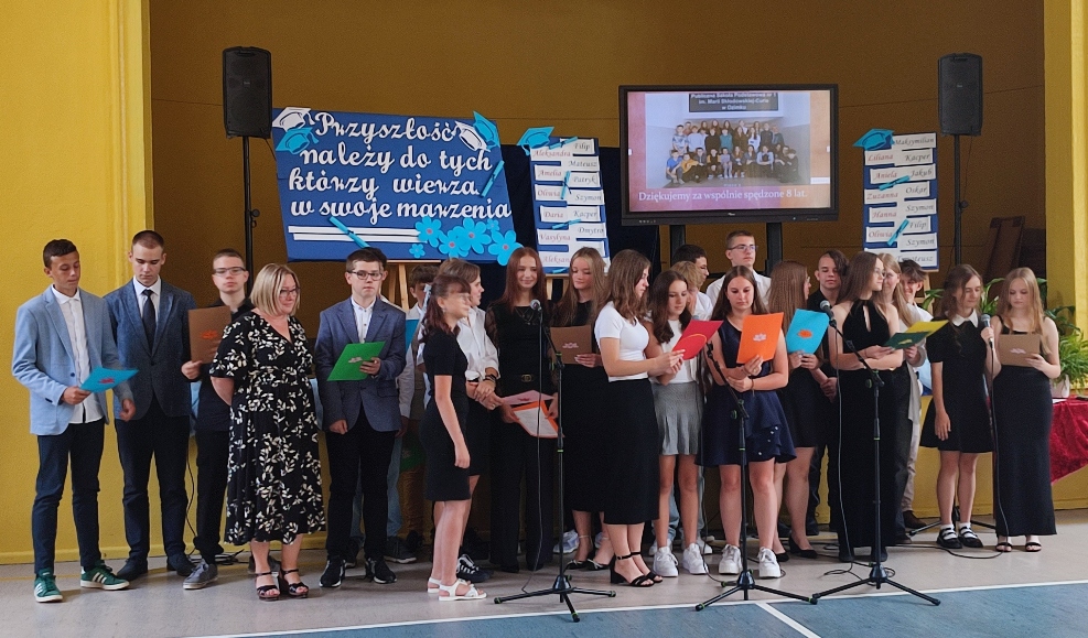 Nasi wspaniali ÓSMOKLASIŚCI pożegnali się ze szkołą. Tanecznym krokiem Poloneza weszli w nowy etap swojego życia. Towarzyszyli im rodzice i dziadkowie, nauczyciele i pracownicy szkoły. Uroczystość zaszczycili swoją obecnością Burmistrz Ozimka Mirosław Wieszołek i Ksiądz Proboszcz Marian Demarczyk. Po pięknych przemówieniach przyszli absolwenci złożyli ślubowanie na sztandar szkoły, a potem nastąpiło przekazanie sztandaru uczniom klasy siódmej. Ósmoklasiści otrzymali, oprócz świadectw, nagrody książkowe za bardzo dobre wyniki w nauce, dyplomy za osiągnięcia sportowe i za ofiarność oraz poświęcenie w szkolnym Wolontariacie. Burmistrz Mirosław Wieszołek wręczył im także stypendia naukowe. Dyrektor Małgorzata Wronowska przekazała dwie statuetki PRYMUSA PSP NR 1 W OZIMKU uczennicom: Liliannie Błażejewskiej i Aleksandrze Wiernej. Rodzice uczniów otrzymali Listy Gratulacyjne i Podziękowania, a w ich imieniu wystąpiła Pani Barbara Krawczuk, która ze wzruszeniem podziękowała za te osiem wspaniałych, wspólnych lat. Uczniowie klasy 7a podarowali śliczne upominki swoim starszym koleżankom i kolegom. Dla nich też wystąpiły uczennice z klasy 6a w żywiołowym tańcu oraz uczniowie klasy 7a w nostalgicznej piosence. Na zakończenie uczniowie klasy ósmej zagrali na gitarach i zaśpiewali piosenki, by pożegnać się ze szkołą ...śpiewająco i wzruszająco. Ósmoklasiści wręczyli kwiaty i podziękowania na ręce Pani dyrektor, kwiaty i podziękowania nauczycielom i pracownikom administracji i obsługi szkoły, ale przede wszystkim pożegnali się ze swoją długoletnią wychowawczynią, Panią Grażyną Łygą. Pani Łyga życząc swoim wychowankom powodzenia i sukcesów, powiedziała, że "na świadectwie nie ma ocen za wytrwałość i odwagę, za empatię i przyjaźń, za kreatywność i poczucie humoru, za trudne decyzje i pokorę, bo świadectwo to papier, a człowiek to opowieść!"