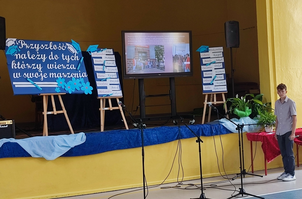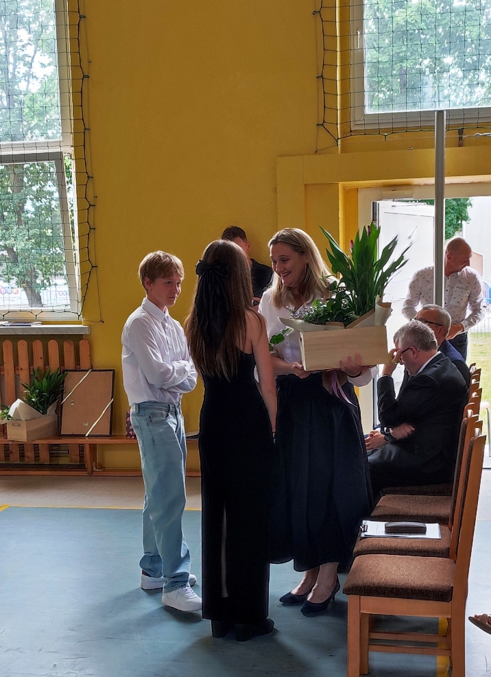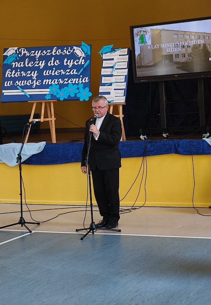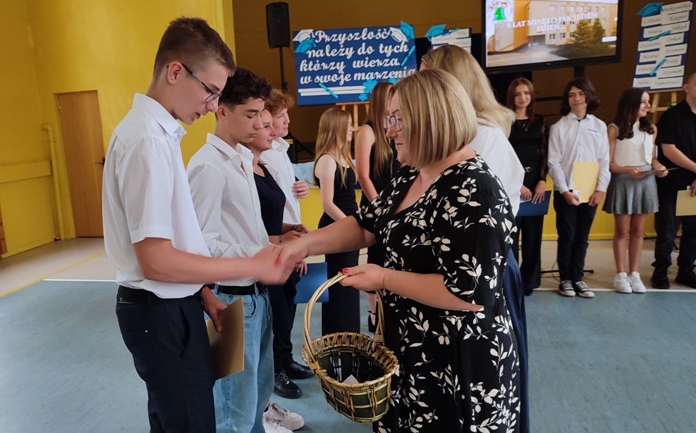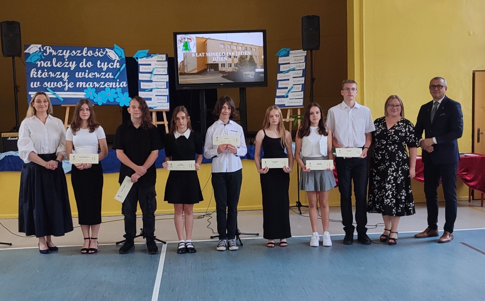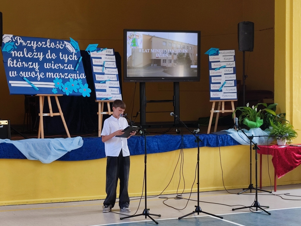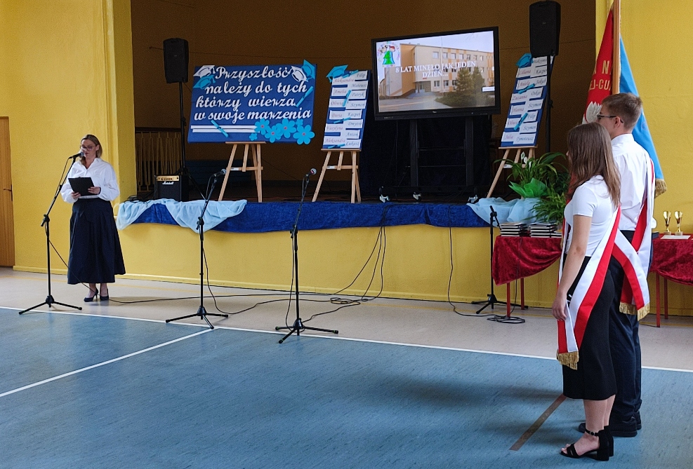 Nasi wspaniali ÓSMOKLASIŚCI pożegnali się ze szkołą. Tanecznym krokiem Poloneza weszli w nowy etap swojego życia. Towarzyszyli im rodzice i dziadkowie, nauczyciele i pracownicy szkoły. Uroczystość zaszczycili swoją obecnością Burmistrz Ozimka Mirosław Wieszołek i Ksiądz Proboszcz Marian Demarczyk. Po pięknych przemówieniach przyszli absolwenci złożyli ślubowanie na sztandar szkoły, a potem nastąpiło przekazanie sztandaru uczniom klasy siódmej. Ósmoklasiści otrzymali, oprócz świadectw, nagrody książkowe za bardzo dobre wyniki w nauce, dyplomy za osiągnięcia sportowe i za ofiarność oraz poświęcenie w szkolnym Wolontariacie. Burmistrz Mirosław Wieszołek wręczył im także stypendia naukowe. Dyrektor Małgorzata Wronowska przekazała dwie statuetki PRYMUSA PSP NR 1 W OZIMKU uczennicom: Liliannie Błażejewskiej i Aleksandrze Wiernej. Rodzice uczniów otrzymali Listy Gratulacyjne i Podziękowania, a w ich imieniu wystąpiła Pani Barbara Krawczuk, która ze wzruszeniem podziękowała za te osiem wspaniałych, wspólnych lat. Uczniowie klasy 7a podarowali śliczne upominki swoim starszym koleżankom i kolegom. Dla nich też wystąpiły uczennice z klasy 6a w żywiołowym tańcu oraz uczniowie klasy 7a w nostalgicznej piosence. Na zakończenie uczniowie klasy ósmej zagrali na gitarach i zaśpiewali piosenki, by pożegnać się ze szkołą ...śpiewająco i wzruszająco. Ósmoklasiści wręczyli kwiaty i podziękowania na ręce Pani dyrektor, kwiaty i podziękowania nauczycielom i pracownikom administracji i obsługi szkoły, ale przede wszystkim pożegnali się ze swoją długoletnią wychowawczynią, Panią Grażyną Łygą. Pani Łyga życząc swoim wychowankom powodzenia i sukcesów, powiedziała, że "na świadectwie nie ma ocen za wytrwałość i odwagę, za empatię i przyjaźń, za kreatywność i poczucie humoru, za trudne decyzje i pokorę, bo świadectwo to papier, a człowiek to opowieść!"