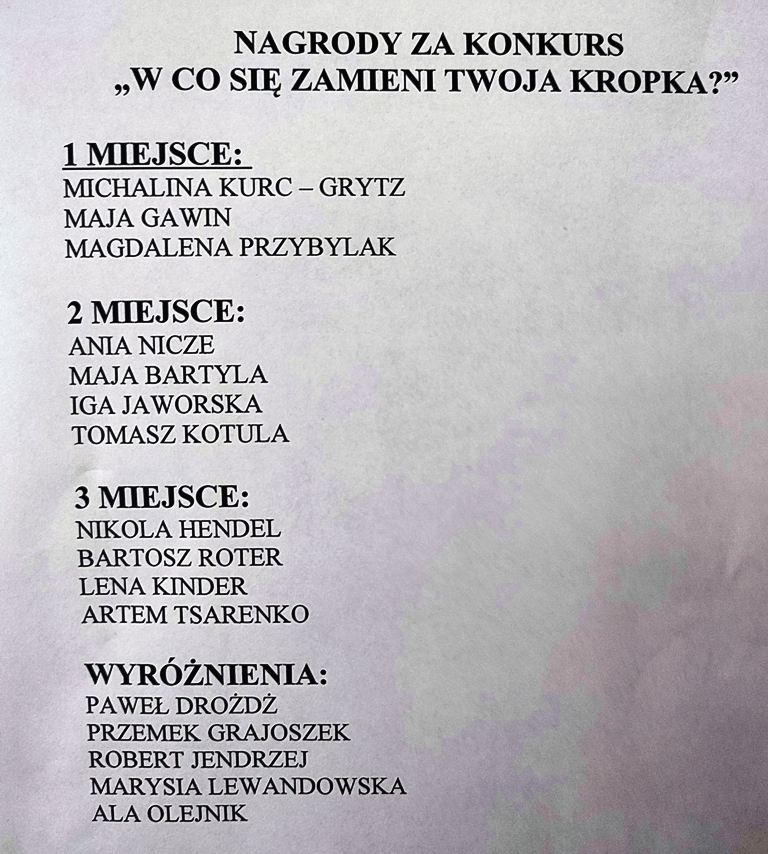Któż nie zna historii Vashti i jej sławnej kropki oraz święta, które powstało? W Dniu Kropki "dzieci, a nawet dorośli tworzą prace plastyczne, biorą udział w zabawach i zadaniach, których celem jest pobudzenie wyobraźni i zachęcenie do wiary we własne możliwości". W naszej szkolnej bibliotece, co roku, organizowany jest konkurs plastyczny "W co się zamieni Twoja kropka?, który ma na celu pobudzenie kreatywności, pomysłowości naszych uczniów oraz rozwijanie ich talentu. Każde dziecko, które wzięło udział w konkursie zostało nagrodzone. Nagrody wręczała dyrektor szkoły, pani Małgorzata Wronowska. Dodać należy, że JURY w składzie: Karolina Stręk - przewodnicząca, Violetta Oliwa i Grażyna Świercz nie miało łatwego wyboru, gdyż wszystkie dzieci bardzo się postarały. Zapraszamy uczniów do udziału w kolejnym konkursie za rok, przez który nich się wasza kreatywność, pomysłowość i talent pięknie rozwijają!