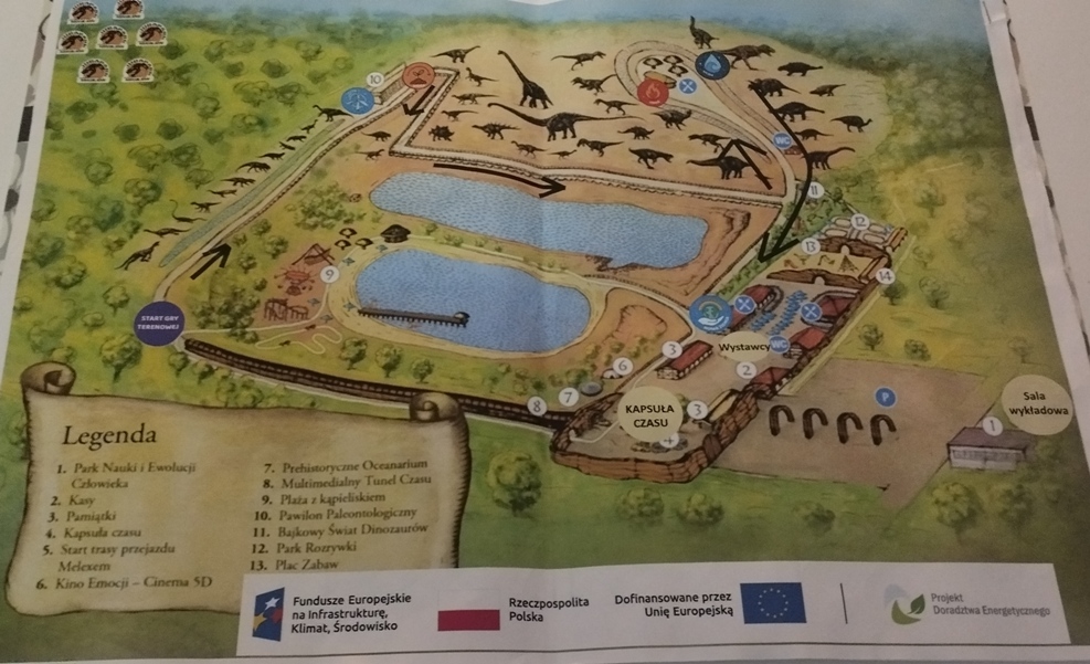 Po wyjściu z kapsuły rozpoczęliśmy grę terenową, która wymagała od nas nie tylko wiedzy, ale i sprytu, współpracy oraz dobrej orientacji w terenie. W trakcie pikniku przeszliśmy również ścieżkę edukacyjną na terenie Jura Parku, poznając fascynujące informacje o dinozaurach, ewolucji życia i zmianach klimatycznych.