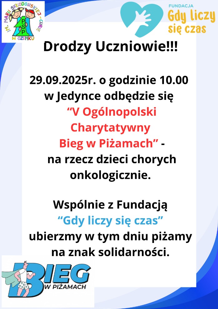Zapraszamy serdecznie do Biegu w Piżamach - pobiegniemy dla dzieci, które potrzebują pomocy i wsparcia! Już 29 września o godzinie 10.00 w naszej JEDYNCE!