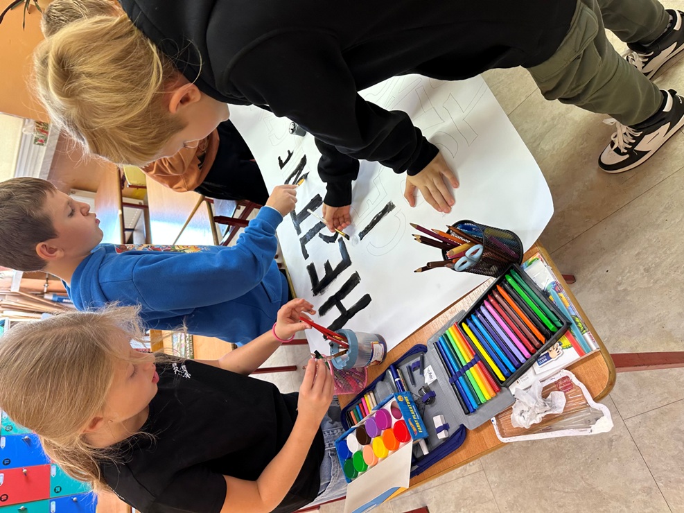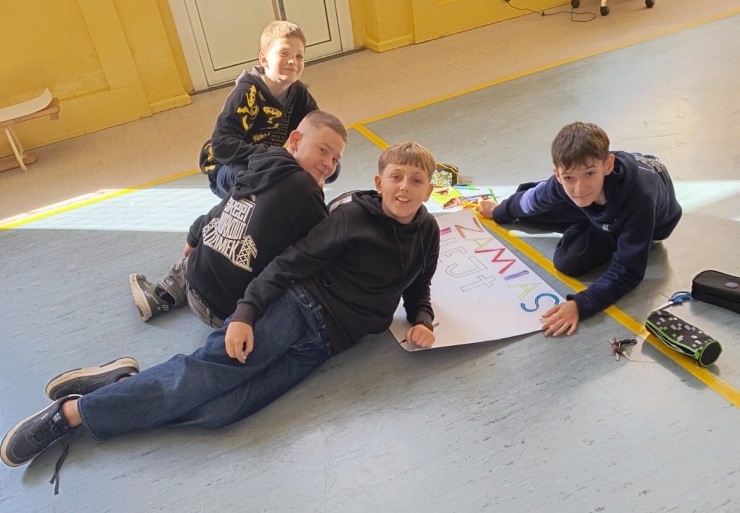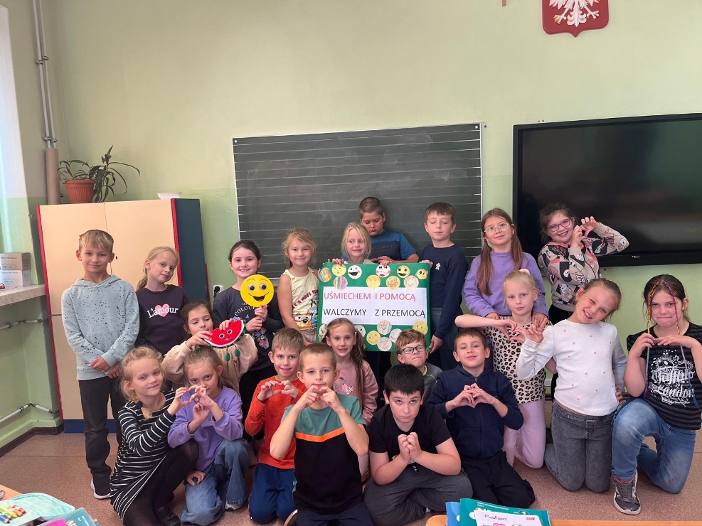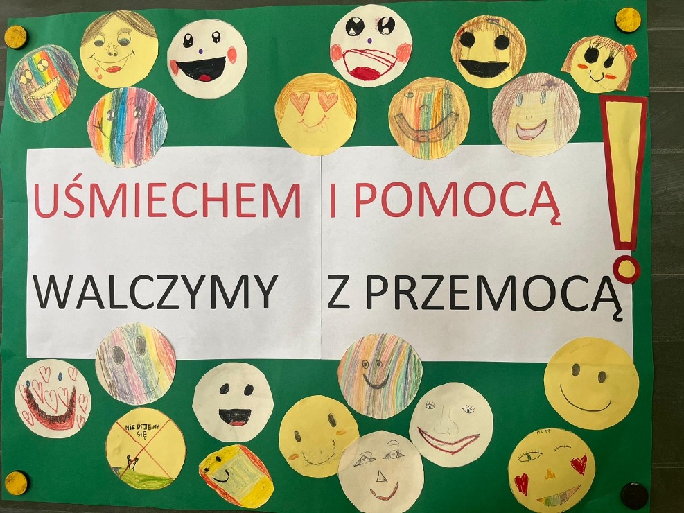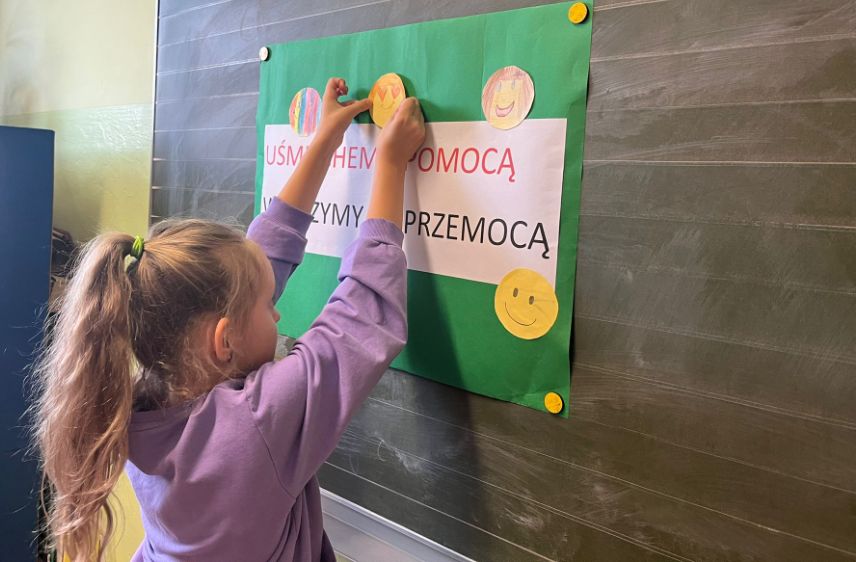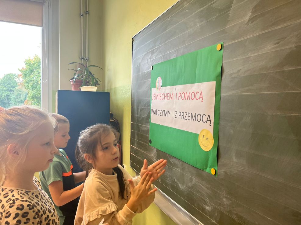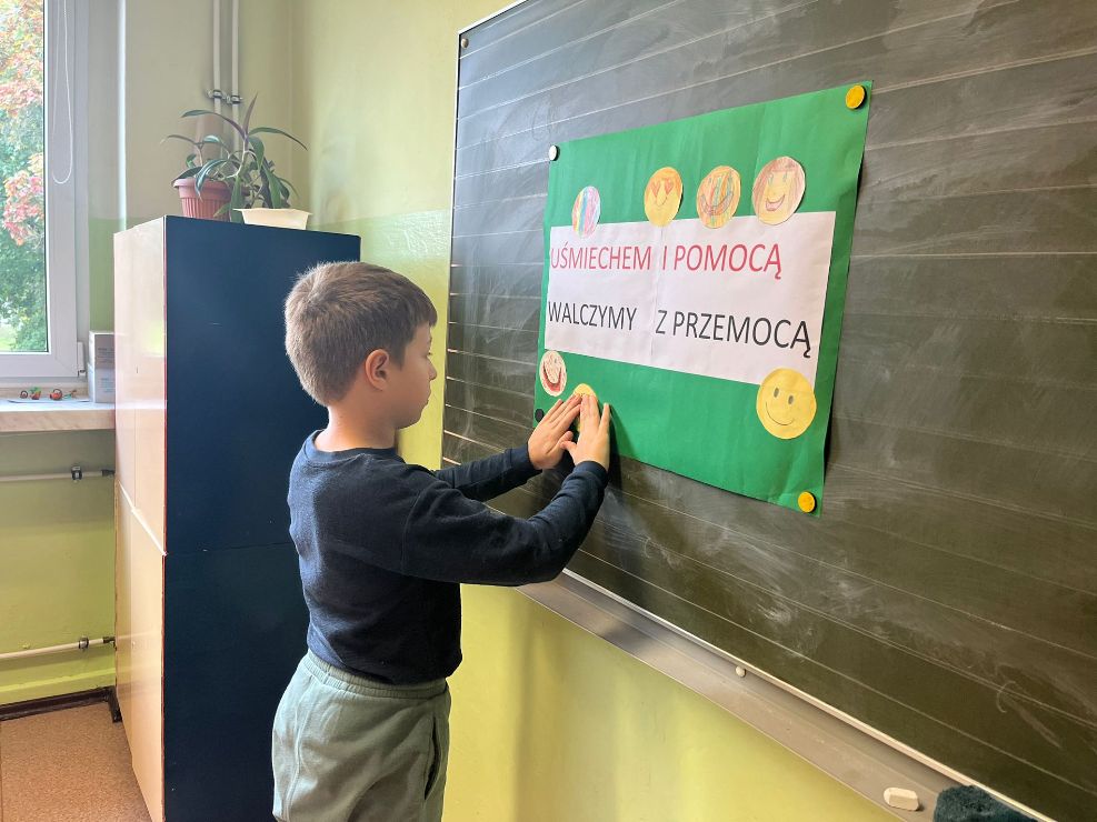 Każda klasa przygotowała własne hasło antyprzemocowe. Wszystkie prace zawisły na ściance, aby przypominały, że warto budować dobro i wspierać się nawzajem.
