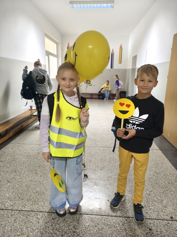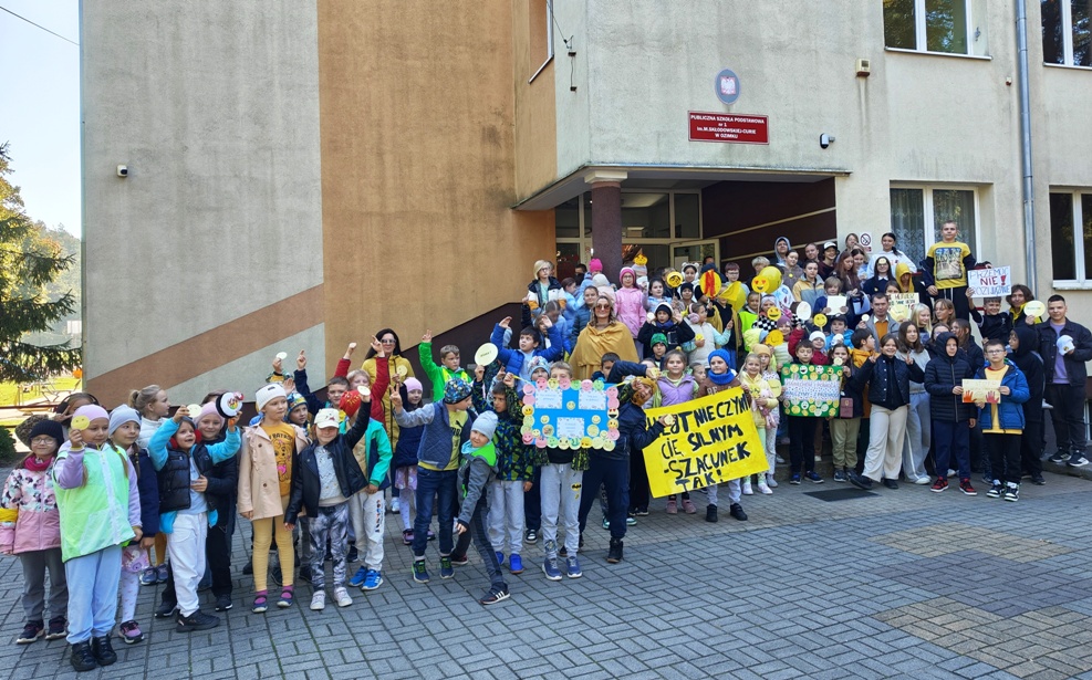 Podczas pochodu nie zabrakło żółtych buziek, transparentów z hasłami życzliwości oraz słów zachęcających do uśmiechu i wzajemnego szacunku. W ten sposób pokazaliśmy, że w naszej szkole życzliwość i uśmiech są silniejsze niż złość i przemoc.