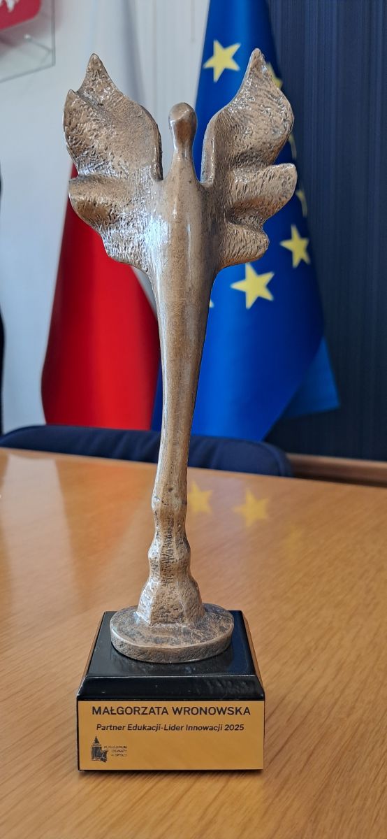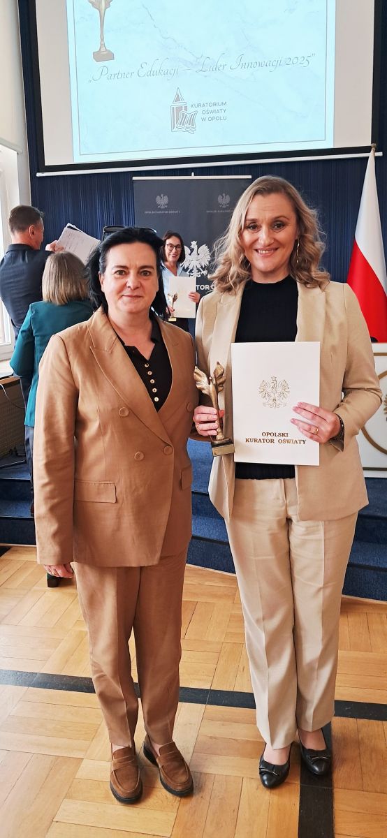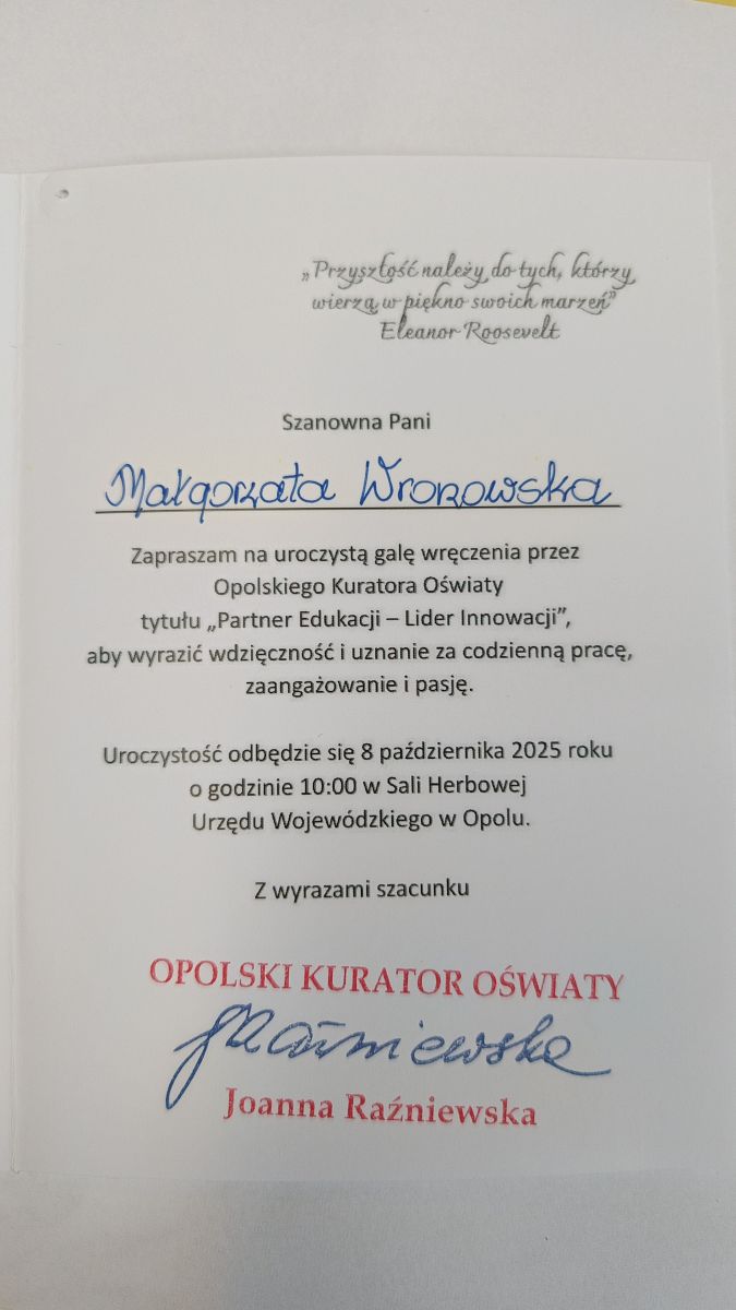 Z ogromną radością informujemy, że 8 października nasza Pani Dyrektor Małgorzata Wronowska odebrała z rąk Opolskiego Kuratora Oświaty prestiżowy tytuł „Partner Edukacji – Lider Innowacji”.