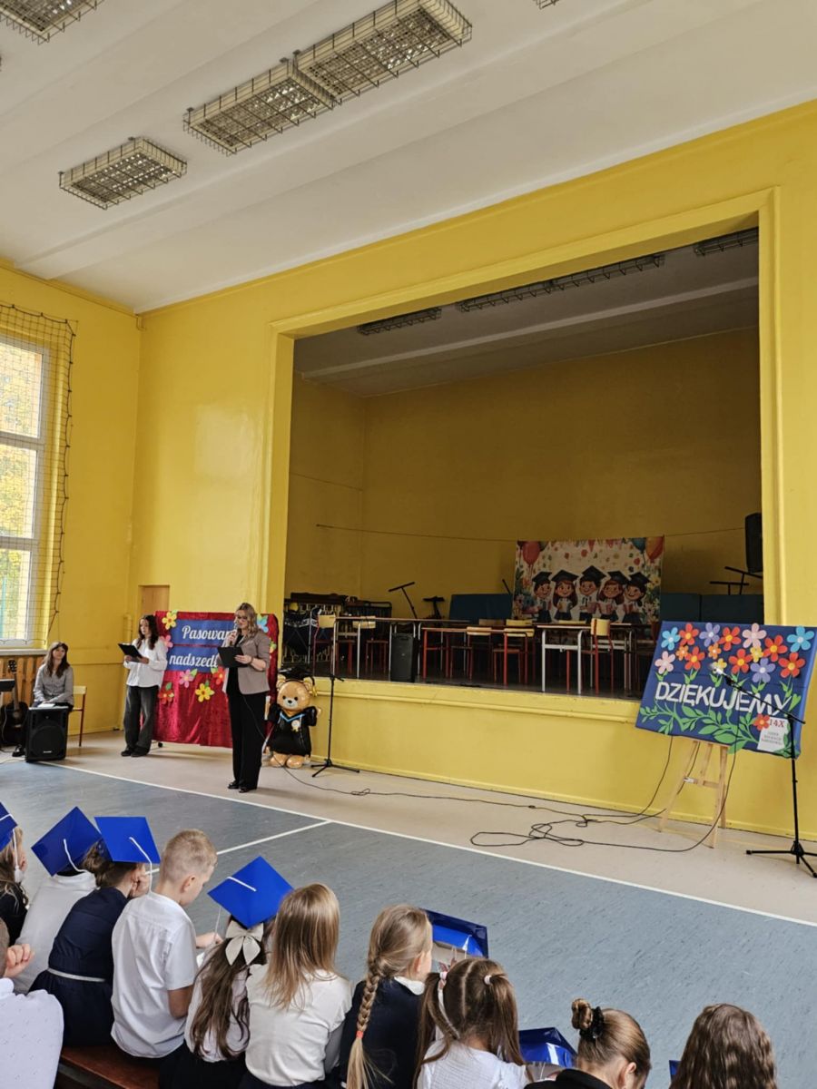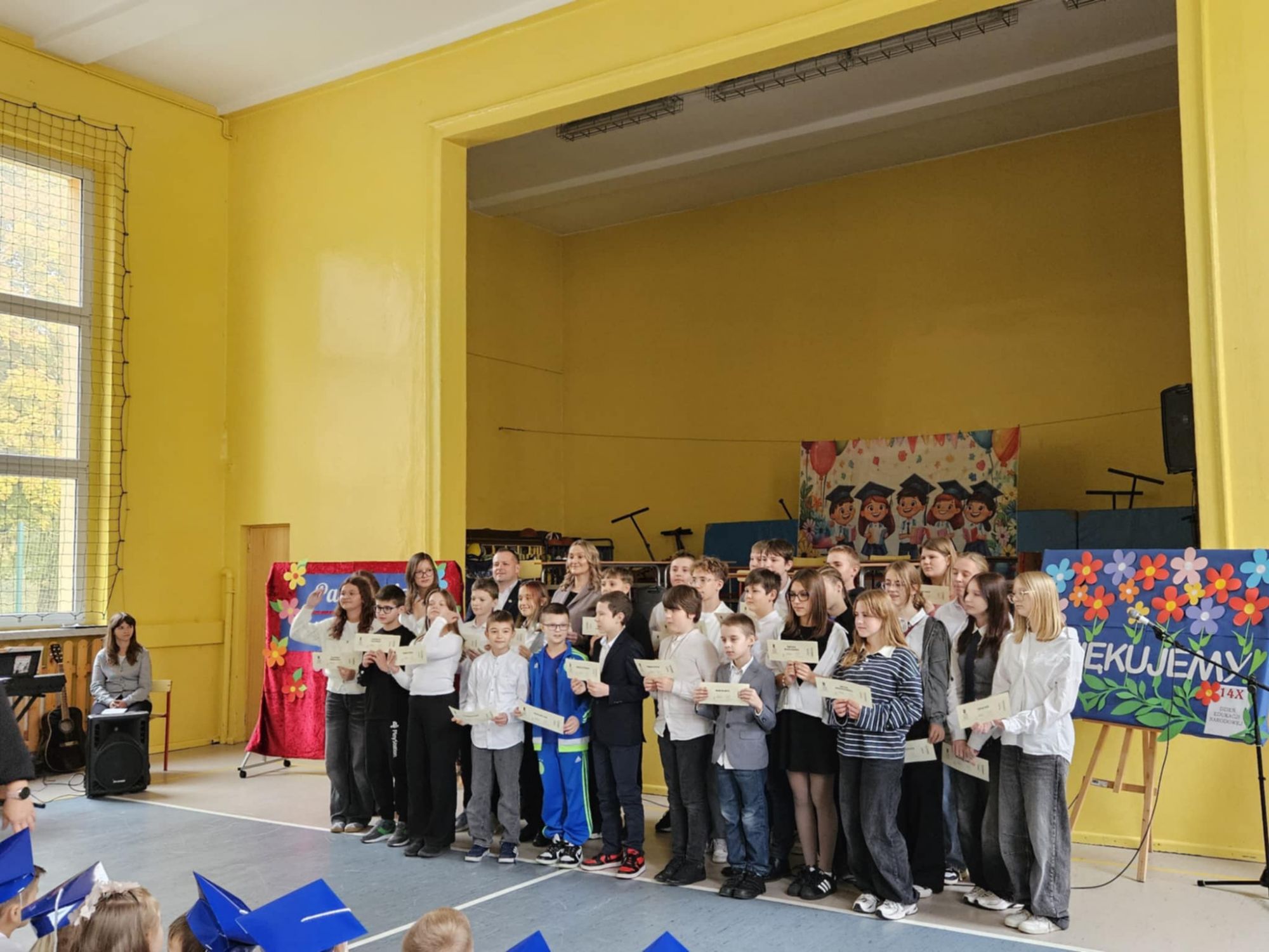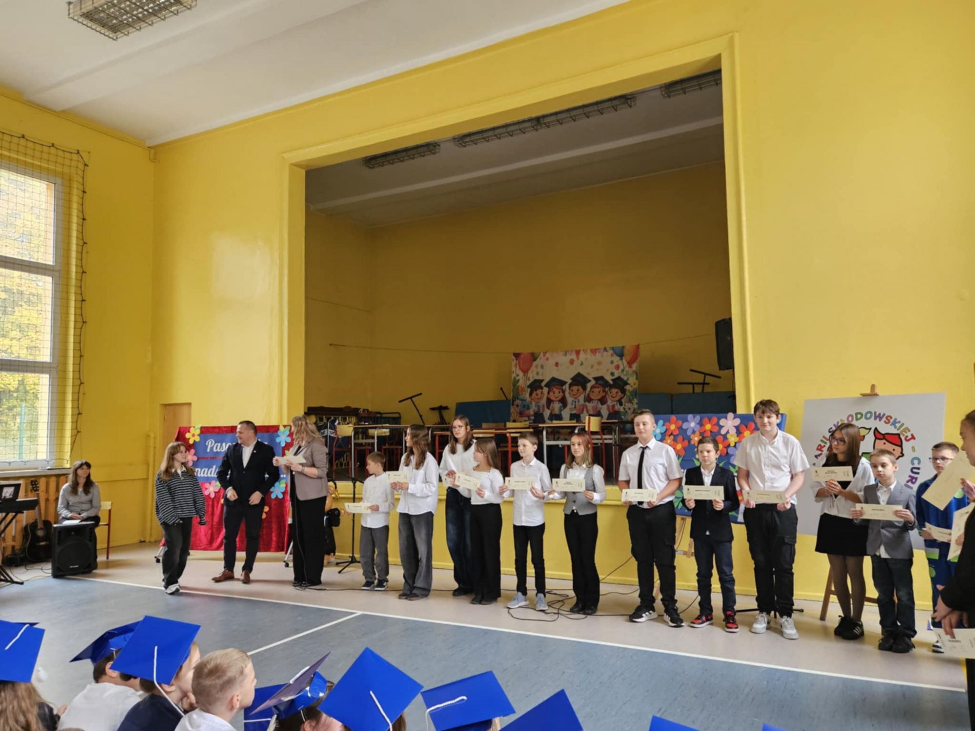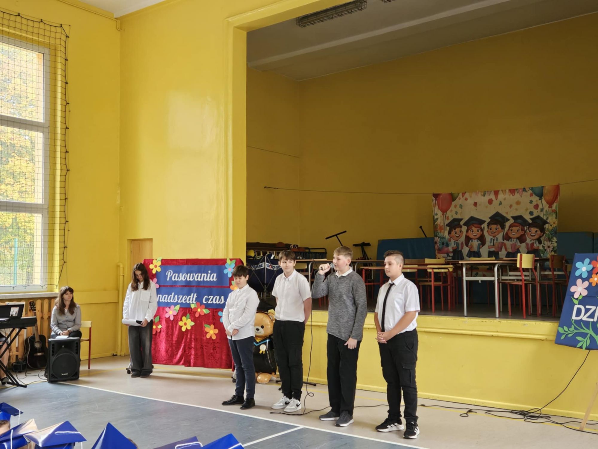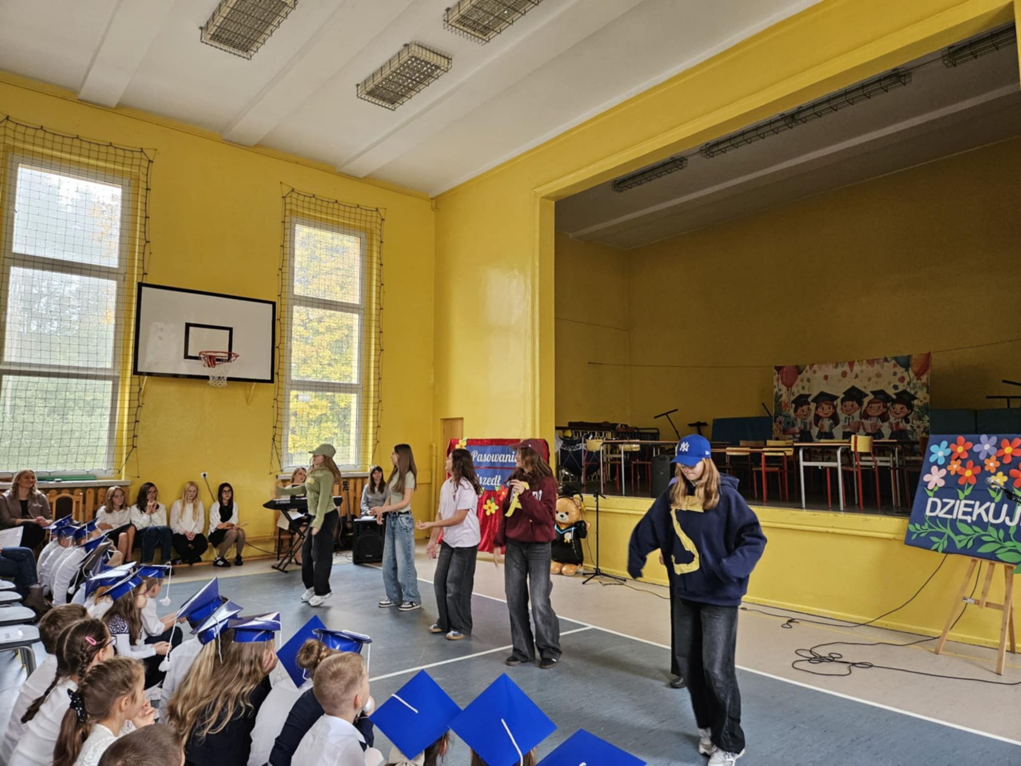 W dniu 13 października w naszej szkole odbył się uroczysty apel z okazji Dnia Edukacji Narodowej. Uczniowie klas IVA i VIIA przygotowali piękny występ  w podziękowaniu nauczycielom i pracownikom obsługi szkoły za ich pracę. Uczniowie zaprezentowali nie tylko swoje umiejętności recytatorskie,  taneczne i wokalne, ale również i aktorskie talenty przedstawiając różne typy nauczycieli oraz dzień z życia klasy IV w nowej odsłonie :) W tym uroczystym dniu nie obyło bez wyróżnień. Najpierw Pani Dyrektor Małgorzata Wronowska wręczyła nauczycielom oraz pracownikom szkoły nagrody dyrektora szkoły. A potem razem z Zastępcą Burmistrza Marcinem Widerą Pani Dyrektor rozdała stypendia uczniom za osiągnięcia w nauce w zeszłym roku szkolnym. Wisienką na torcie było pasowanie klasy pierwszej, która również przygotowała wzruszający występ.