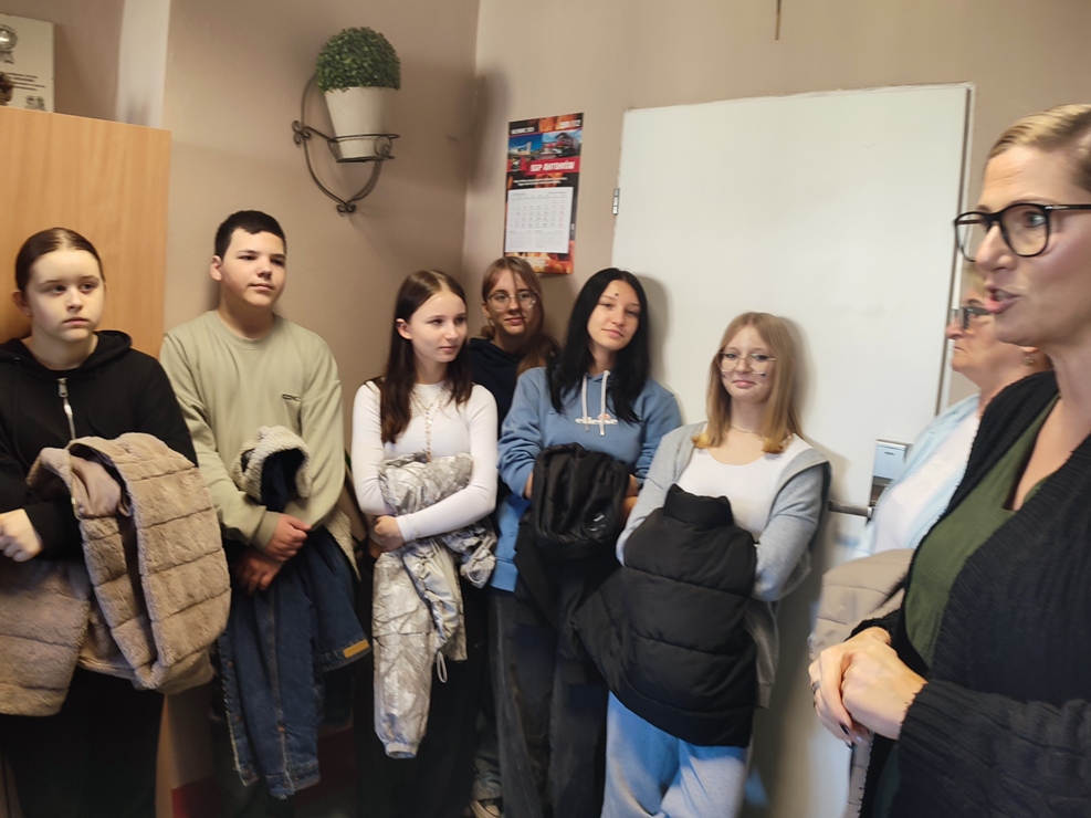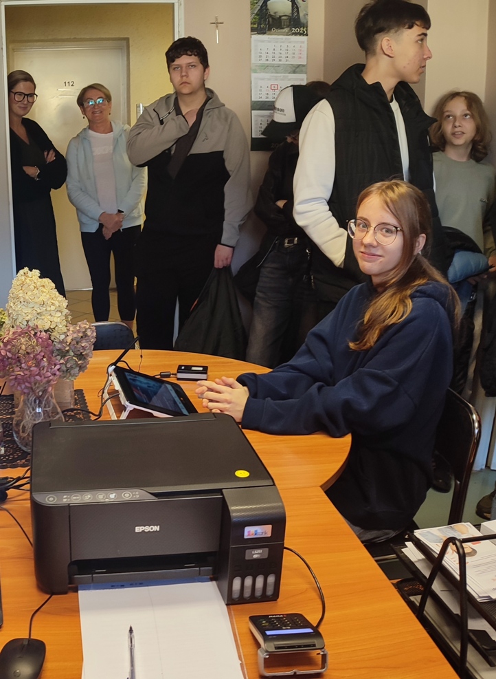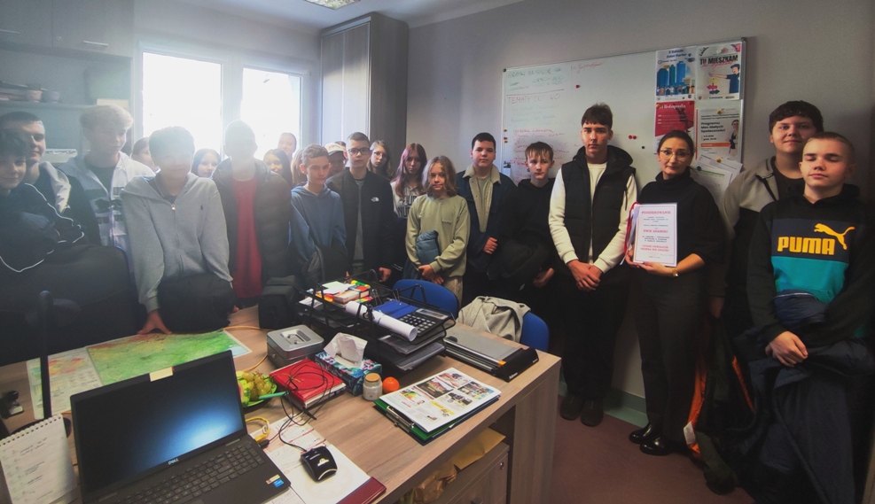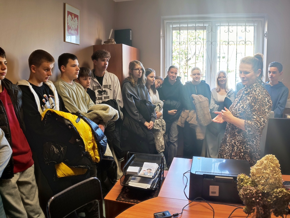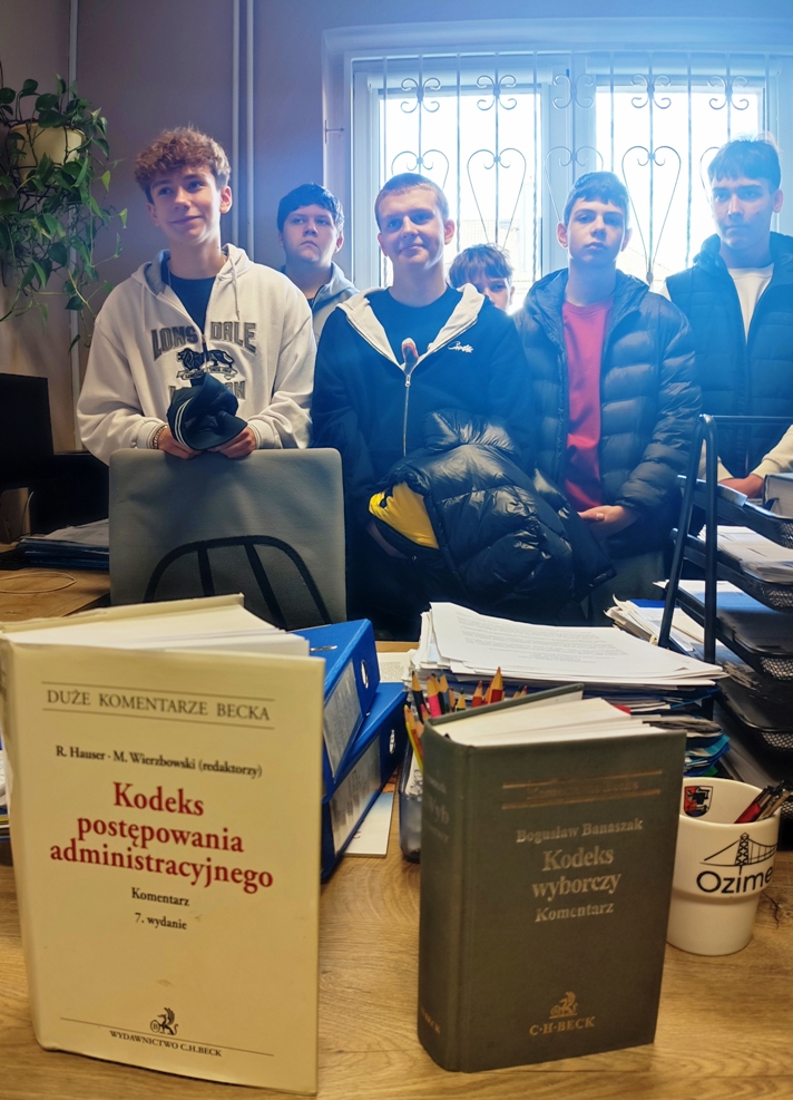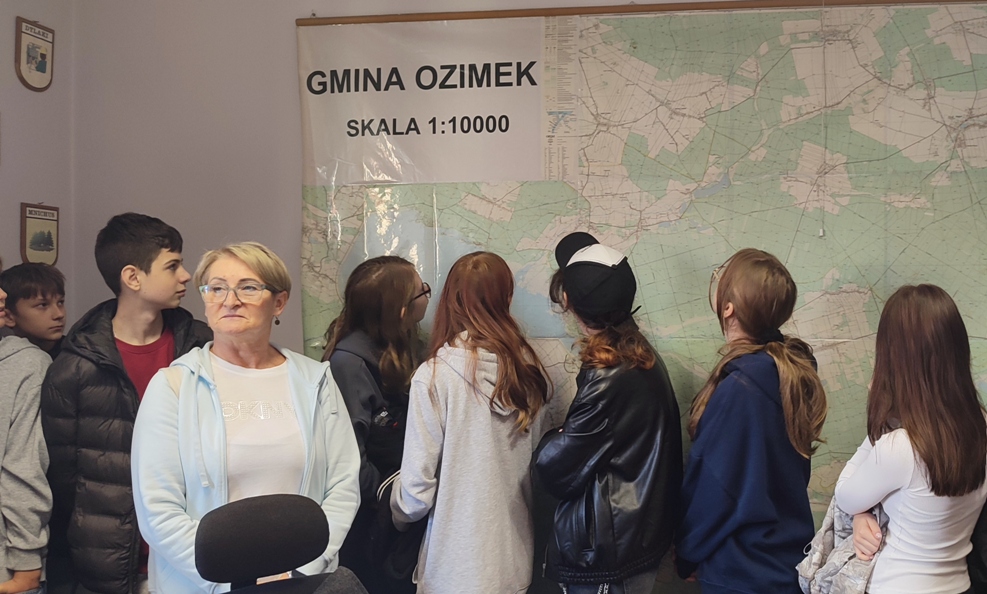 Kolejnym etapem naszej podróży po sercu gminy był Referat Spraw Obywatelskich. Tu kierownik referatu, Pani Katarzyna Smolnik, opowiedziała o jego zadaniach. Uczniowie zobaczyli jak obecnie składa się wniosek o dowód osobisty - wszystko dzieje się błyskawicznie i elektronicznie. Koniec z papierami! Urzędniczka, Pani Agnieszka Mientus, pokazała archiwum, które liczy ogromną ilość teczek i dokumentów. Później zapoznaliśmy się z zadaniami Obrony Cywilnej, szczególnie w obecnych, trudnych czasach. Nikt chyba lepiej nie mógłby tego zrobić niż ppłk. Zbigniew Koziarz, inspektor ds. wojskowych i Obrony Cywilnej gminy Ozimek. Czekała nas też niespodzianka, gdyż od niedawna pracuje tu absolwentka naszej szkoły, Pani Patrycja Kaźmierczak. Nasza szkoła ma MOC!