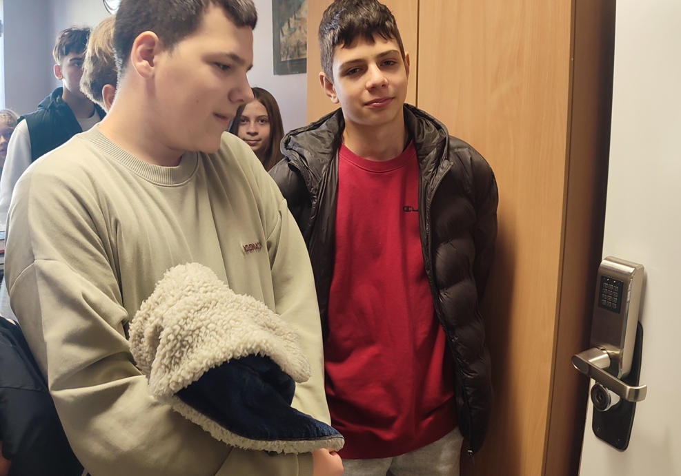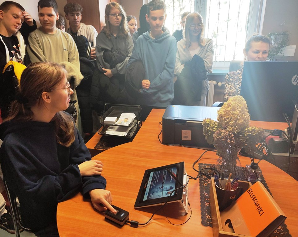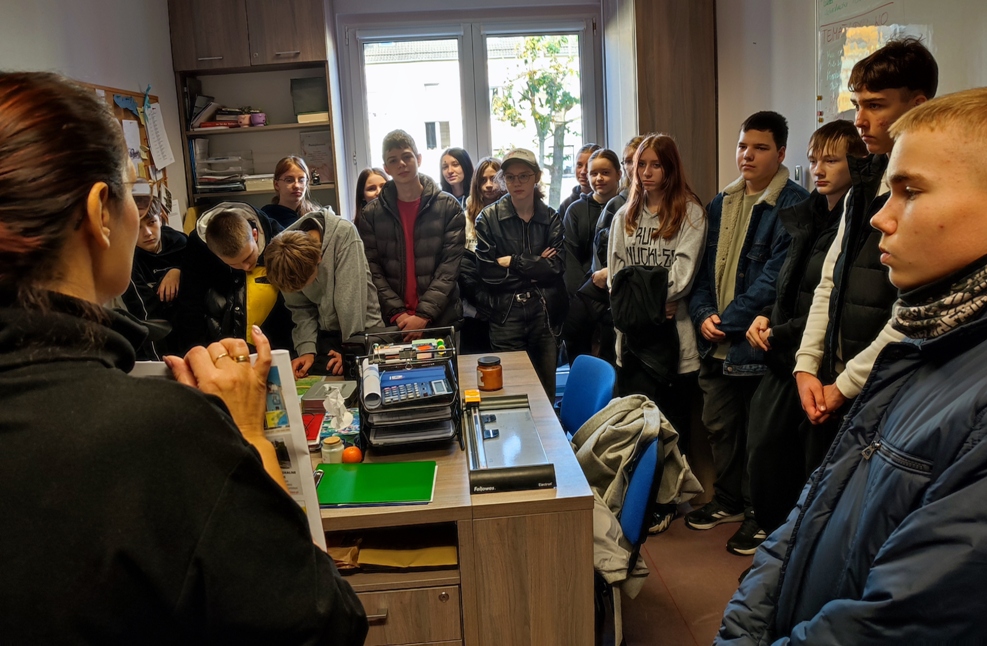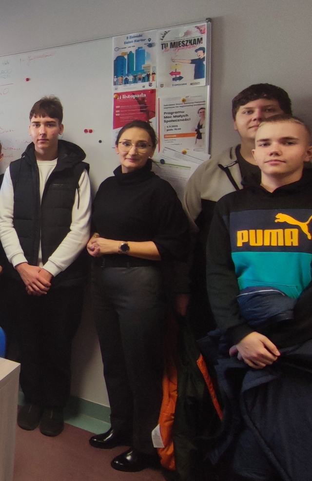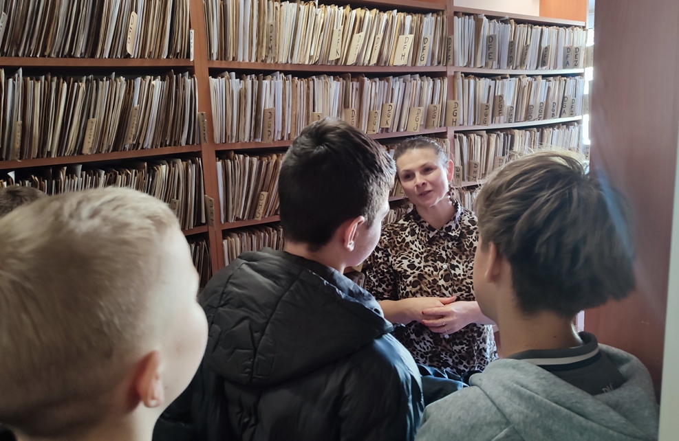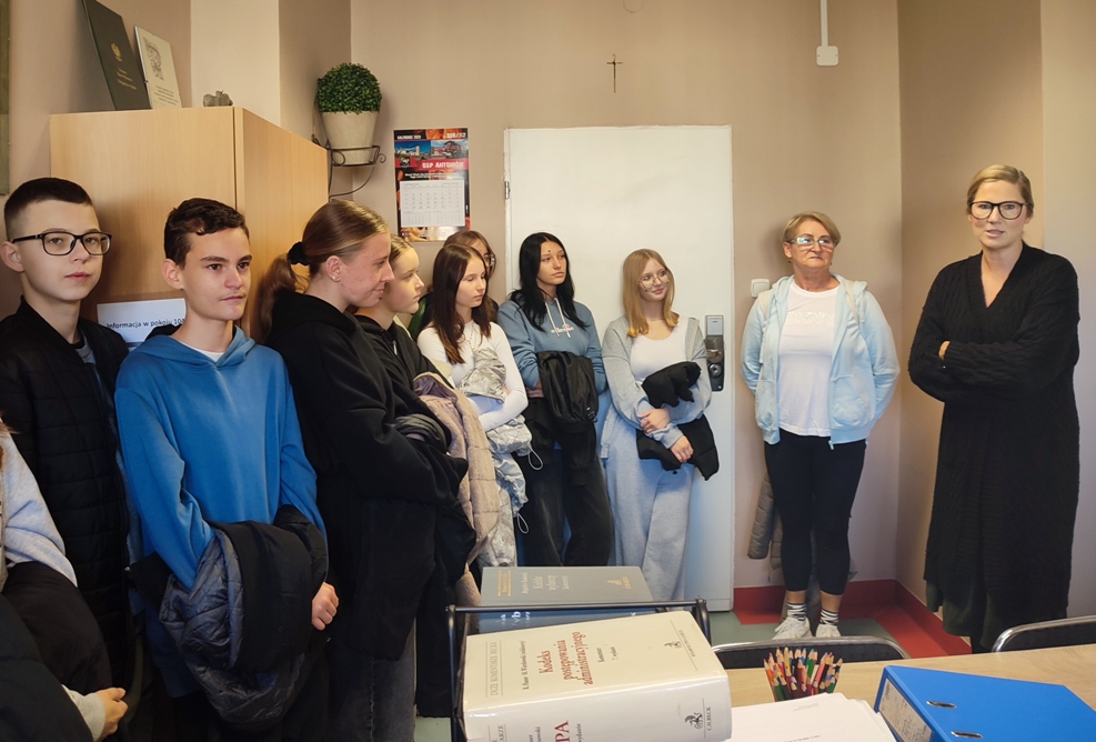 Kolejnym etapem naszej podróży po sercu gminy był Referat Spraw Obywatelskich. Tu kierownik referatu, Pani Katarzyna Smolnik, opowiedziała o jego zadaniach. Uczniowie zobaczyli jak obecnie składa się wniosek o dowód osobisty - wszystko dzieje się błyskawicznie i elektronicznie. Koniec z papierami! Urzędniczka, Pani Agnieszka Mientus, pokazała archiwum, które liczy ogromną ilość teczek i dokumentów. Później zapoznaliśmy się z zadaniami Obrony Cywilnej, szczególnie w obecnych, trudnych czasach. Nikt chyba lepiej nie mógłby tego zrobić niż ppłk. Zbigniew Koziarz, inspektor ds. wojskowych i Obrony Cywilnej gminy Ozimek. Czekała nas też niespodzianka, gdyż od niedawna pracuje tu absolwentka naszej szkoły, Pani Patrycja Kaźmierczak. Nasza szkoła ma MOC!