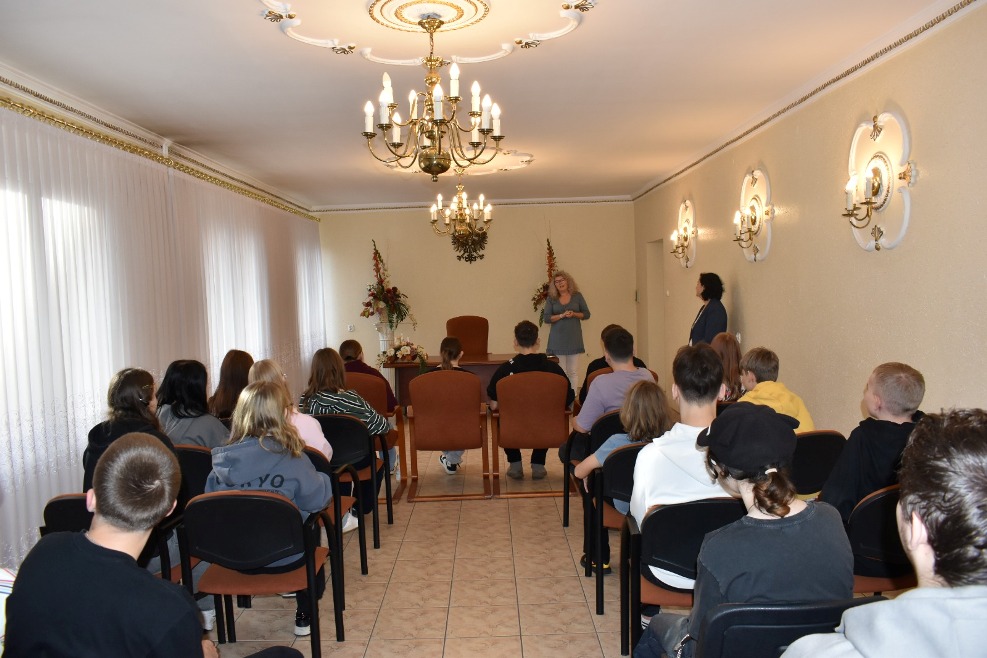W najpiękniejszej sali urzędu, czyli "Sali Ślubów" spędziliśmy kolejne chwile na spotkaniu z kierownikiem Urzędu Stanu Cywilnego, Panią Ewą Bronder. Pani kierownik opowiedziała nam, jakie sprawy załatwić może obywatel w USC. Z dużym zdziwieniem dowiedzieliśmy się, że śluby mogą być udzielone poza siedzibą USC, w dowolnym, stosownym miejscu na terenie gminy Ozimek.