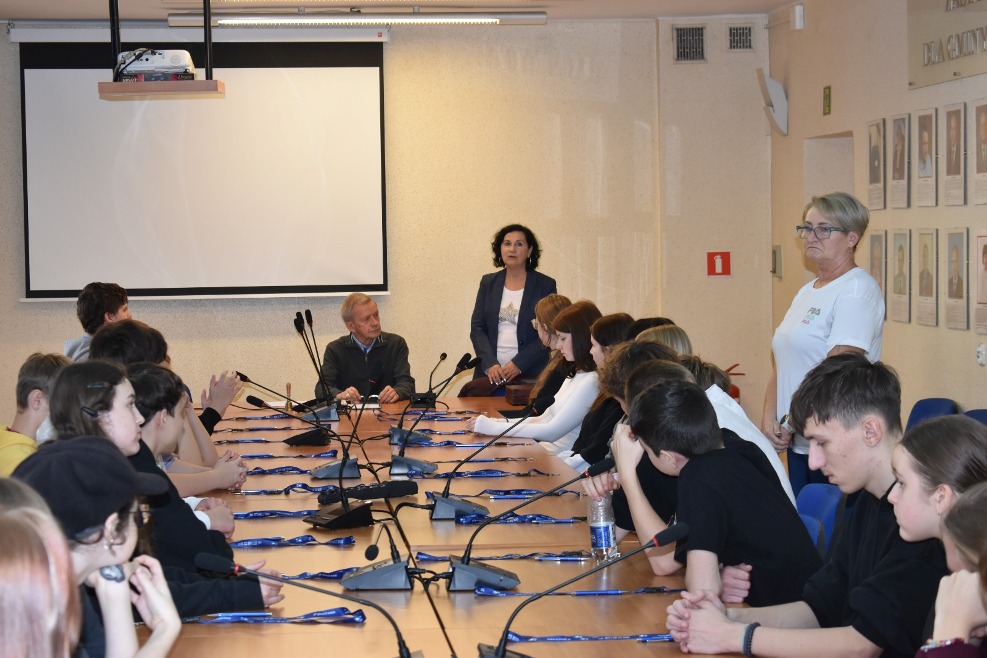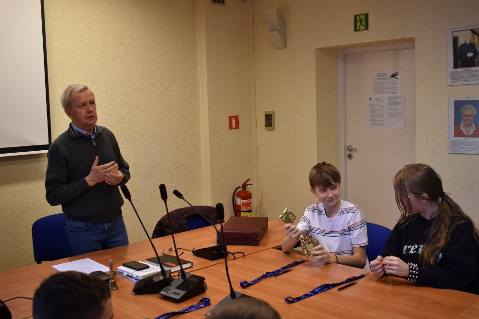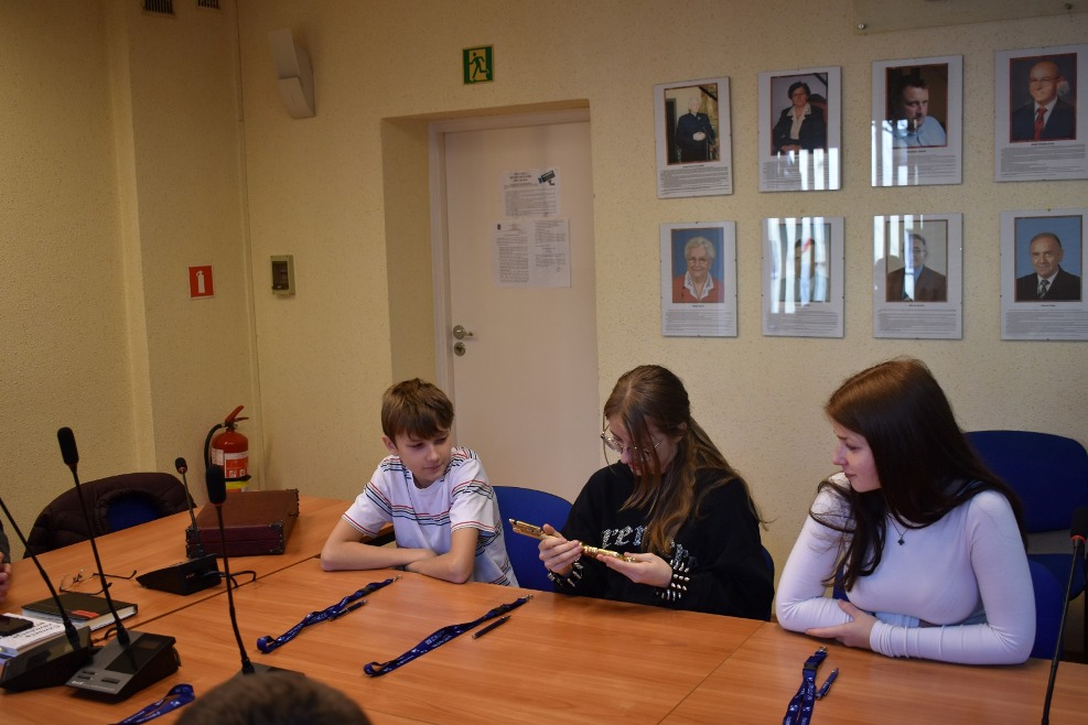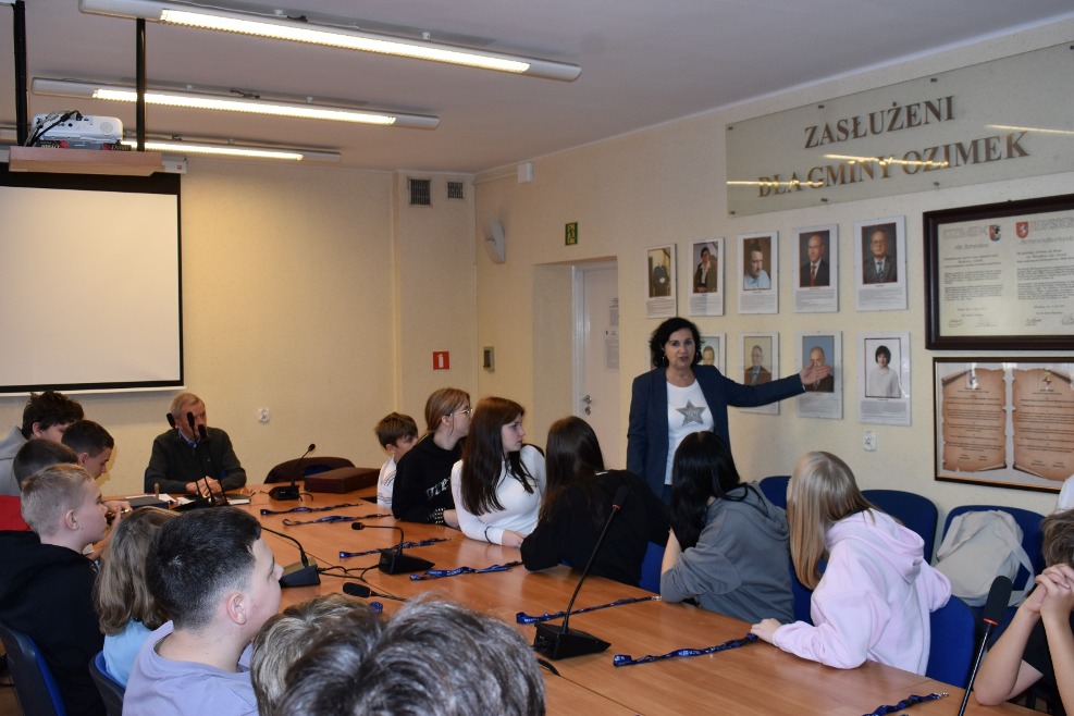 Kolejnym etapem naszej podróży była sala, gdzie odbywają się posiedzenia komisji i sesje Rady Miejskiej w Ozimku. Tu specjalnie na spotkanie z nami przyszedł Przewodniczący Rady Miejskiej w Ozimku Pan Zygmunt Olbryt. Pan Olbryt omówił zadania jakie stoją przed radą miejską, opowiedział jak działają komisje w naszej gminie, jak przebiega podział władzy na uchwałodawczą i wykonawczą. Wszystko to poparte szeroką wiedzą i bogatym, kilkudziesięcioletnim doświadczeniem. Pan Przewodniczący Olbryt zadawał naszym ósmoklasistom pytania, które przede wszystkim miały ich pobudzić do przemyśleń. Uczniowie mogli zobaczyć (i przymierzyć ) łańcuch przewodniczącego rady, a także symboliczny "Klucz do Bram Ozimka".