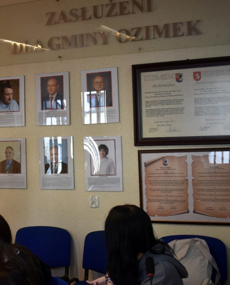 W sali narad znajdują się Akty Partnerstwa i Akty o Przyjaźni Ozimka z zaprzyjaźnionymi miastami w Europie, a także galeria sylwetek Honorowych Obywateli Ozimka oraz Zasłużonych dla Ozimka. Tu szczególne miejsce zajmuje Pani Leonarda Płoszaj, obecnie wieloletni Wicestarosta Opolski. Pani Płoszaj jest nam szczególnie bliska, gdyż jest absolwentką naszej JEDYNKI i wzorem do naśladowania. Jest też znaną postacią w naszej szkole: z realizacji projektów z Czechami, różnorodnych działań i wizyt w JEDYNCE, do której z sentymentem wraca.