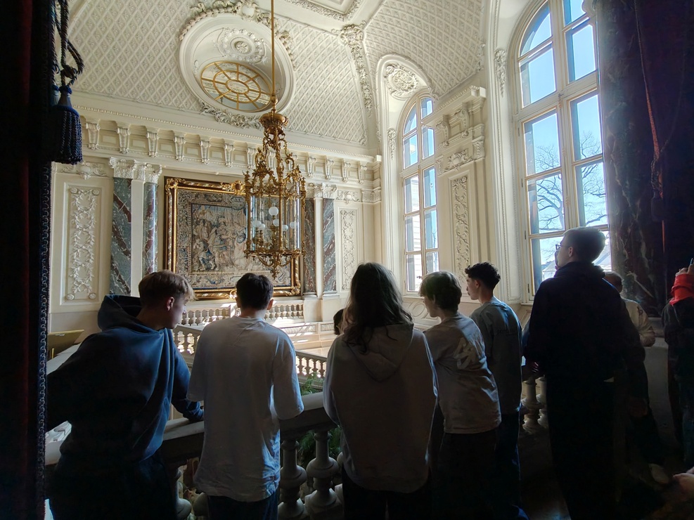 Kolejnym etapem wyjazdu był Zamek w Pszczynie. Spacerując w ten piękny wiosenny dzień po założeniu parkowo – krajobrazowym zamku pszczyńskiego, podziwialiśmy jego kilkusetletnią historię. Następnie uczniowie udali się do środka, aby podziwiać wnętrza muzeum zamkowego. Poznali historię obiektu, który w swoich dziejach nie tylko zmieniał właścicieli, ale również wielokrotnie był przebudowywany. Zamek z gotyckiej budowli obronnej za panowania rodu Promnitzów zamienił się w reprezentacyjną renesansową rezydencję, a później w pałac barokowy. Lata świetności przeżywał także za panowania książąt z rodu Anhalt-Köthen-Pless i hrabiów z rodu Hochbergów. Zamek w Pszczynie godny jest zwiedzenia, gdyż zachowało się w nim historyczne i bogate wyposażenie, należy więc do nielicznych muzeów tego typu w naszej części Europy.